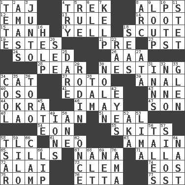 ACROSS 1. _ Mahal 4. Long journey 8. High mountains 12. Australian flightless bird 13. Governing power 14. Carrot, for example 15. Hyperbolic tangent 17. Shout 18. Scutum 19. _____ Park, CO 21. Before (prefix) 23. Pacific Standard Time (abbr.) 24. Having a sole or soles 26. American Automobile Association (abbr.) 28. Lightbulb-shaped fruit 30. Snuggling 34. Domesticated feline 37. Printing process, for short 39. Of or related to the anus 40. Bear (Spanish) 41. Peak District village in England 43. Compass dir. 44. Gumbo ingredient 46. "If ____ say so..." 47. Manchild 48. Of or relating to Laos or its people 51. Anneal 54. A really long time 55. Burlesque acts 58. Affectionate concern, for short 61. Modern: prefix 63. With great haste 65. Beverly of Met fame 67. Grandmother 71. Silent film actress Nazimova 72. Jai ____ 73. Clement's nick name 74. Greek goddess of the dawn 75. Play 76. Singer James 77. Fast jet (abbr.) DOWN 1. False hair 2. Collect or gather 3. Secret group 4. Attempt to accomplish something 5. Regret 6. Pipe bend 7. Seaweed 8. Curve 9. Central Nebraska county 10. Plant holders 11. Proofreading order 16. Aid 18. Oceans 20. Observe 22. Actress Charlotte 25. Have the gumption 27. _ moment's notice (2 wds.) 29. "The Thinker" sculptor 30. Pitcher Ryan 31. Taverns 32. Billionth: prefix 33. Small, secluded valley 34. Calm and collected 35. "____ silly question..." 36. "Corrida" creature 38. Scottish cap 42. Sight organs 45. Had dinner 49. Charged atoms 50. A saturated hydrocarbon 52. Alias (abbr.) 53. Pale green bean 56. Falsehoods 57. Grain storage towers 58. Russian ruler of old 59. _ and Stitch 60. Dollar (slang) 62. At one time in the past 64. Political cartoonist Thomas 66. Mouth edge 68. The first octave above the treble staff 69. Remaining after all deductions 70. Nanny (var.)