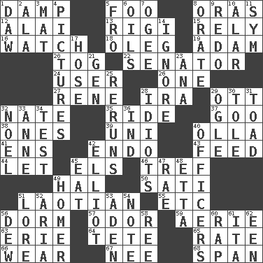 ACROSS 1. Moist 5. Egg _ yung 8. Mouths or openings 12. Mountain range southwest of Kyrgyzstan 13. Swiss mountan, "Queen of the Mountains" 15. Have confidence or faith in 16. Timepiece 18. Cassini of fashion 19. First of billions? 20. Coat; cloak 22. Elected representative 24. One who uses or employs something 26. Single 27. French philosopher Descartes 28. Lyricist Gershwin 29. Baseball player Mel 32. Nathan's nickname 35. Travel on an animal 37. Thick or sticky substance 38. Washington bills 39. University (slang) 40. Rounded earthenware pot or jar 41. Followers of ems 42. Inside; within (prefix) 43. Nourish 44. Allow 45. Raised railways 46. Unclean, religiously 49. Actor Linden 50. Suttee (variant) 51. Of or relating to Laos or its people 55. And so on (abbr.) 56. Dormintory (informal) 57. Aroma 59. Nest on high 63. One of the Great Lakes 64. False hair 65. Pace 66. Erode 67. Born 68. Connect, as a bridge DOWN 1. Obsolete 2. According to 3. Floor covering 4. Photos 5. Away 6. Petroleums 7. Double curve, resembling the letter S 8. Declaim 9. Redecorate 10. Having or resembling wings 11. Symbol (abbr.) 14. Snub 17. Stockings 21. Commissioned military rank (abbr.) 23. Santa ___, CA 25. Summer TV shows 28. Foolish or stupid persons 29. Stare 30. Lacquered or enameled metalware 31. Frog relative 32. Christmas carol 33. Singer Murray 34. Trial 36. Working for oneself (abbr.) 40. Persons of authority 42. American author Paul (1891-1958) 45. Consume 47. Actress Charlotte 48. Singer James 49. Simpsons dad 51. Old wives' tales, e.g. 52. Operatic vocal solo 53. An important port of Yemen 54. Make mention of 56. Morning condensation 58. To riddle 60. Strike 61. Call ___ day 62. Car or cant ending
