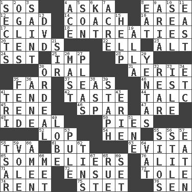 ACROSS 1. Distress signal 4. "____ silly question..." 8. Comfort 12. Mild oath 14. Team commander 16. Length times width 17. 154 in Roman numerals 18. Pleas 20. Looks after 22. Pipe bend 23. Keyboard modifier key 24. Fast jet (abbr.) 25. Naughty child 28. Strand of rope, yarn or thread 30. Of the mouth 31. Nest on high 35. Distant 37. Oceans 40. Egg locale 41. Be inclined (to) 42. Clothes sense 44. Baby powder 45. French philosopher Descartes 46. Coast Guard woman 47. "We ___ not amused" (Victoria) 48. Standard of perfection 50. Sliced desserts 52. Trim (branches) 54. Layer 55. Compass dir. 58. Federal power corp. 61. On the contrary 63. Webber/Rice musical 65. Wine waiters 70. Came down and settled, as after flight 71. Toward shelter 72. Take place subsequently 73. Lacquered or enameled metalware 74. Monthly bill 75. Proofreading order 76. Elected rep. DOWN 1. Religious groups 2. Stares at amorously 3. Virtuous person 4. Adept person 5. Male child 6. Krazy ___ of comics 7. Land measure 8. Erode 9. Operatic vocal solo 10. Stitch closed the eyes of (a falcon) 11. Compass direction 13. Movie disc 15. Assist 19. Silent film actress Nazimova 21. Title for a knight 26. Vertical spar for supporting sails 27. Entreaties 29. Gossips 30. Severe or trying experience 32. Stern 33. Small island 34. And so on (abbr.) 35. Nourish 36. Singer Murray 38. Viper 39. Staphylococcus 41. Three (prefix) 43. 4th largest of the Great Lakes 49. Ear part 51. Compass dir. 53. Whimper 55. Grain storage towers 56. Vertical member of a panel or frame 57. Consumed 58. Russian ruler of old 59. Grand slam 60. So be it 62. Airtight sealed metal containers 64. Large container 66. Was introduced to 67. Eastern Standard Time (abbr.) 68. Regret 69. Arrange properly for use