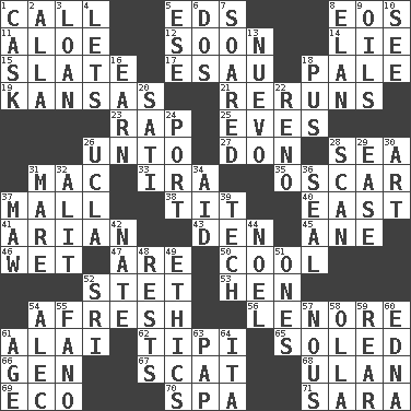 ACROSS 1. Give a ring to 5. Begley and Asner 8. Greek goddess of the dawn 11. Medicinal plant 12. Within a short period 14. Untruth 15. Schedule 17. He sold his birthright 18. Light colored 19. Sunflower state 21. Summer TV shows 23. Strike 25. Nights before holidays 26. To (old English) 27. Spanish title 28. Ocean 31. Big _ 33. Retirement account (abbr.) 35. Witty Wilde 37. Promenade 38. Teat (slang) 40. 90 degrees 41. Believer in; advocate of (suffix) 43. Lair 45. A saturated hydrocarbon 46. Dripping 47. "We ___ not amused" (Victoria) 50. Calm and collected 52. Proofreading order 53. Layer 54. Anew 56. Poe poem 61. Jai ____ 62. Native american tent (variation) 65. Having a sole or soles 66. Commissioned mil. rank 67. Leave at once 68. ____ Bator 69. Environmental prefix 70. Health resort 71. "Two Mules for Sister ____" DOWN 1. Keg 2. Silent film actress Nazimova 3. Grant temporary use of 4. Allows 5. Compass dir. 6. Two (Sp.) 7. Flew 8. Liveliness 9. Petroleums 10. Observe 13. New (sp.) 16. Merit 18. Product of festering 20. Suttee (variant) 22. Former U.S. Attorney General Janet 24. Sweet dark-red dessert wine 26. Southern CA. univ. 28. Skim 29. Relaxation 30. Nonscientific branch of learning 31. Female horse 32. Set down 34. Help 36. Lick closed 37. Opening into something insatiable 39. Technical 42. Nathan's nickname 44. Christmas carol 48. Musical pauses 49. Moral principles 51. Washington bills 52. Indian title of respect (Mr.) 54. Actor Baldwin 55. Papal veil 57. Common sense 58. Water jar 59. Located in or toward the back 60. Pulitzer Prize-winning author Ferber 61. Mature 63. Infant food 64. Call ___ day