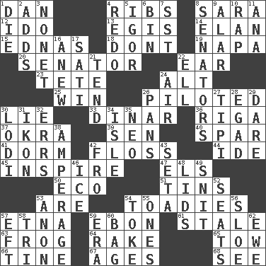 ACROSS 1. One of the 12 tribes of Israel 4. Chest bones 8. "Two Mules for Sister ____" 12. Wedding promise 13. The front part of a cuirass 14. Enthusiasm 15. Ferber et al. 18. Do not 19. California wine valley 20. Elected representative 22. Hearing organ 23. False hair 24. Keyboard modifier key 25. Victory 26. Manned the helm 30. Falsehood 33. Middle Eastern gold or silver currency 36. Capital of Latvia 37. Gumbo ingredient 39. Elected rep. 40. Coast Guard woman 41. Dormintory (informal) 42. Soft thread for cleaning between teeth 44. Binary compound 45. Motivate 47. Raised railways 50. Environmental prefix 51. Airtight sealed metal containers 53. "We ___ not amused" (Victoria) 54. Sycophants 57. Inactive volcano in Sicily 59. Inky black, to poets 61. Lacking originality or spontaneity 63. Tree-dwelling hopper 64. Libertine 65. Pull behind 66. Prong on a fork 67. Grows older 68. Perceive with the eye DOWN 1. Expire 2. Does sums 3. Music written for nine 4. Do over again 5. Composer Stravinsky 6. Storage container 7. Fast jet (abbr.) 8. Legislators 9. Having or resembling wings 10. Strike 11. Santa ___, CA 16. Afresh 17. Suttee (variant) 21. Watch over 22. Pipe bend 24. Wind 26. Baking dishes 27. Native american tent (variation) 28. Mild oath 29. Have the gumption 30. Farming town in central California 31. Picture 32. Blunders 34. Capri or Wight 35. Modern: prefix 38. Electrical Measurement 42. From 43. Bristle 46. Frozen water 48. Flaplike coverings 49. In a ____ (agitated or irritated) 52. Theater features 53. At once, immediately (arch.) 54. Puff or smoke 55. Singles 56. A type of plum 57. Bank Draft (abbr.) 58. Three (prefix) 59. Period 60. Paper or plastic container 62. She-sheep