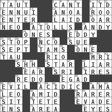 ACROSS 1. Strained 5. Patter 9. It would 12. World-weariness 14. Small Philippine buffalo 15. Friend of Pooh 16. Keyboard key 17. Put down 18. Boat paddle 19. Modern: prefix 20. Ringlike coral islands and reefs 23. Actor Griffith 24. Washington bills 25. Whirlpool 27. Constrict 30. Non-commissioned officer (abbr.) 32. Take to court 33. Back-to-school mo. 34. Scottish caps 36. Single 38. The 19th letter of the Greek alphabet 39. _ de Janeiro 40. Medical imaging device (abbr.) 43. Quiet! 46. Play the lead 48. One who doesn't tell the truth 49. Ewer handle 51. _ Lanka 52. Angers 53. Redecorate 54. Mild oath 56. Morally bad or wrong 58. Being or containing an acid 61. Housemaid (var.) 64. Lion 65. Among 66. Less widely known 68. Be seated 69. Wig 70. Elude 71. Followers of ems 72. Type of rug 73. Snake ____ (dice throw) DOWN 1. Adolescent 2. Singer Murray 3. To (old English) 4. Third day of the wk. 5. Give a ring to 6. Of or related to the anus 7. Annoying sounds 8. Small amount or degree 9. Literary sarcasm 10. Frog relative 11. Rowboat 13. SW Asia republic 21. Portable shelter 22. Motion picture awards 23. Arabian gulf 24. Choose 26. Superhero pair 27. Fast jet (abbr.) 28. Afternoon social gathering 29. Musical composition 31. Leaves out 35. Flew 37. Independent ruler or chieftain 41. Actress Charlotte 42. Big collection agency 44. The bottom of a shoe or boot 45. Possessed 47. Swiss mountan, "Queen of the Mountains" 48. Flaplike covering 50. Wanderer 53. Disturbances 55. 1/640 square mile 56. Otherwise 57. Distinctive style or manner 59. Quote 60. It may be bright or harebrained 61. Like ___ of sunshine 62. Ancient Persian 63. Ancient Greek god of war 65. _ moment's notice (2 wds.) 67. "___ Maria"