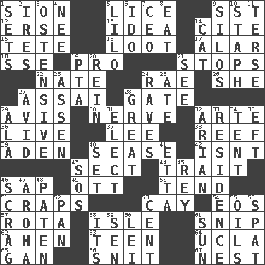 ACROSS 1. The Jewish people; Israel 5. Louse (plural) 9. Fast jet (abbr.) 12. Celtic language 13. It may be bright or harebrained 14. Quote 15. False hair 16. Plunder 17. Having or resembling wings 18. Compass dir. 19. Adept person 21. Discontinues 22. Nathan's nickname 24. Actress Charlotte 26. A female animal or person 27. Slender Brazilian palm 28. Yard entry 29. Advice 30. Boldness 32. Johnson of "Laugh-In" 36. Not recorded 37. Area sheltered from the wind 38. Coral collection 39. An important port of Yemen 40. Gospel singer Marvin 42. Is not 43. Religious group 44. Distinguishing feature 46. Plant excrement 49. Baseball player Mel 50. Look after 51. Dice game 53. Island 54. Greek goddess of the dawn 57. Roll call or roster of names 58. Small island 61. Clip 62. So be it 63. Adolescent 64. Southern CA. univ. 65. Separate the seeds from cotton 66. In a ____ (agitated or irritated) 67. A home for chicks DOWN 1. Puts into a specified state 2. Angers 3. Clearly or manifestly demonstrative 4. Born 5. _ and Stitch 6. Wedding promise 7. Corporate head (abbr.) 8. Ingest 9. Grain storage towers 10. Staphylococcus 11. Laconic 14. Domesticated feline 19. Parent Teacher Assoc. 20. It's straight from the horse's mouth 21. Perceive with the eye 23. NE Netherlands city 24. All-night dance parties 25. Had dinner 27. Enthusiastic 28. Relatively large 29. According to 31. Opt 32. Believer in; advocate of (suffix) 33. Dwelling 34. Portable shelter 35. Bank Draft (abbr.) 40. Arrange properly for use 41. Singer James 43. Mayday 45. Marina Del _, California 46. Lean end of the neck 47. Odor 48. Eucharist need 52. Baking dish 53. Penny 55. Lubricates 56. Argument over a trivial matter 58. ___ a Wonderful Life 59. Elected rep. 60. Flowery wreath 61. Player for Phoenix