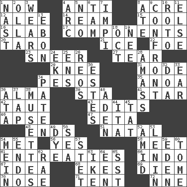 ACROSS 1. Immediately 4. Against 8. 1/640 square mile 12. Toward shelter 14. 480, 500 or 516 sheets of paper 15. Implement 16. Broad, flat, thick piece 17. Pieces 20. Edible starchy tuberous root 21. Frozen water 22. Enemy 23. Scornful expression 27. Pull into pieces 29. Leg joint 31. Method 34. Mexican monetary units 35. Small Philippine buffalo 36. _ mater 39. R.R. building 41. Play the lead 42. Pulled tight 43. Proofreads 46. Domed church section 47. Bristle 48. Conclusions 51. Brizilian seaport 54. Was introduced to 56. Affirmative reply 58. Confront 61. Pleas 66. Southeast Asian peninsula 67. It may be bright or harebrained 68. Supplements with great effort 69. South Vietnam president (1954) 70. Sense of smell 71. Portable shelter 72. Compass dir. DOWN 1. Political cartoonist Thomas 2. Spanish pot 3. Erodes 4. Curve 5. Modern: prefix 6. Scottish cap 7. Body of Kaffir warriors 8. Had dinner 9. Meet 10. Printing process, for short 11. Otherwise 13. Inky black, to poets 18. Sep. follower 19. Born 24. Supplement with great effort 25. Followers of ems 26. Vintage cars 28. Collect or gather 30. _____ Park, CO 32. ___ good deed 33. Ewer handle 34. Eucharist need 36. "One Day ___ Time" 37. Infant locale 38. French bagpipes 40. An important port of Yemen 44. Call ___ day 45. Make lace 49. Color 50. Ocean 52. Among 53. Soviet premier 1918-24 54. Count _ (2 wds.) 55. Inside; within (prefix) 57. Proofreading order 59. Locale of original sin 60. Heavy book 62. Actress Charlotte 63. Mamie's mate 64. Car or cant ending 65. Fast jet (abbr.)