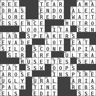 ACROSS 1. To sift 4. Pull into pieces 8. Nursemaid (var.) 11. Mouths or openings 13. Inside; within (prefix) 14. Actor Baldwin 15. Old wives' tales, e.g. 16. Make new 17. Electrical Unit 18. Gist 21. Paris' subway 22. Plunder 23. Call ___ day 25. Car or cant ending 26. Experiment locale 29. Orators 32. Elude 34. Car dealer's back yard 35. Erode 38. Grain storage tower 39. Biscuitlike quick bread 41. Capital of Western Samoa 43. Title for a knight 44. Sandy's bark 45. Extreme 46. French bagpipes 50. Ocean 51. Make lace 54. Compass dir. 55. I made a mistake 57. Came up 59. Motivate 63. Unsightly 64. Mountain range 67. Roberta Peters solo 68. Inside of hand 69. Prong on a fork 70. Confederate soldiers (slang) 71. Raised railways 72. Prepare for publication 73. Compass dir. DOWN 1. Hero or heavy, e.g. 2. Greek god of love 3. Hearing organs 4. Cylindrical with tapered ends 5. Compass dir. 6. Find the sum of 7. Friend of Pooh 8. Having winglike extensions 9. Distance measurement (Brit.) 10. Gambison 12. Sew up the eyelids of hawks and falcons 14. Deep reverence 19. Characteristic smell of wine 20. Police officer (slang) 21. Spoil 23. Image 24. False hair 26. French article 27. Advice 28. Indonesian resort city 30. Upward 31. Lick closed 33. Dormintory (informal) 36. Flats, for short 37. Become fatigued 39. Backtalk 40. Group working together 42. Auto club (abbr.) 45. United States Postal Service (abbr.) 47. Purpose 48. Bathroom plumbing fixture 49. A really long time 51. Grayish beige 52. Therefore, facetiously 53. For Whom the Bell _____ 56. Coast Guard woman 58. Symbol (abbr.) 60. Angers 61. Chest bones 62. Comfort 64. Shoshoni 65. To free from 66. Black tropical American cuckoo