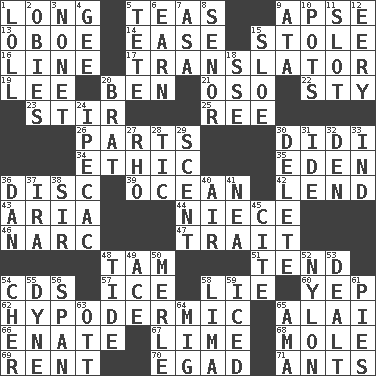 ACROSS 1. Yearn 5. Beverages made from leaves 9. Domed church section 13. Mitch Miller's instrument 14. Relaxation 15. Took without asking 16. Actor's bit 17. Interpreter 19. Area sheltered from the wind 20. Benjamin's nick name 21. Bear (Spanish) 22. Filthy place 23. Tumult 25. To sift 26. Pieces 30. "You Light Up My Life" star Conn 34. Moral principle 35. Paradise 36. Compact _ 39. Sea 42. Grant temporary use of 43. Roberta Peters solo 44. Sibling's daughter 46. Drug cop 47. Distinguishing feature 48. Scottish cap 51. Watch over 54. Music discs 57. Frozen water 58. Falsehood 60. Slangy assent 62. Subcutaneous 65. Mountain range southwest of Kyrgyzstan 66. Related on the mother's side 67. Citrus frut 68. Undercover agent 69. Monthly bill 70. Mild oath 71. Pismires DOWN 1. Hang loosely or laxly 2. Off-Broadway awards 3. Music written for nine 4. Turn to the right 5. Wig 6. Merit 7. White ___ sheet 8. Sir (Sp.) 9. _ moment's notice (2 wds.) 10. Plant holders 11. Slit 12. Suggestive of the supernatural 15. _ gin 18. Compass dir. 20. Naughty child 24. Medicinal drug used to evoke vomiting 27. 17th letter of the Greek alphabet 28. Nervous spasm 29. Aroma 30. Keyboard key 31. Binary compound 32. Lair 33. Working for oneself (abbr.) 36. Daniel's nick name 37. Retirement account (abbr.) 38. Title for a knight 40. Wind 41. Teachers' org. 45. Quote 48. Periodic rise and fall of the sea level 49. Adept person 50. Haggard of country music 52. High-strength synthetic material 53. Started a card game 54. "Mermaids" star 55. Centimeter-gram-second unit of force 56. Connect, as a bridge 58. Pale green bean 59. On the rocks 61. Sliced desserts 63. Baseball player Mel 64. Russian fighter aircraft 65. Nanny (var.)