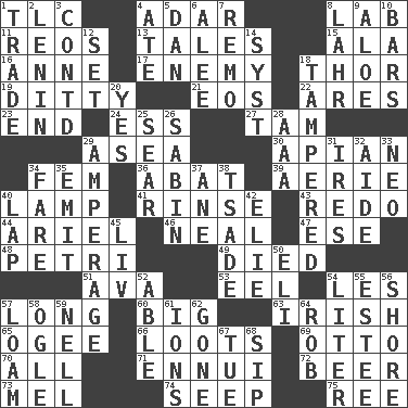 ACROSS 1. Affectionate concern, for short 4. The sixth month of the Jewish calendar 8. Experiment locale 11. Vintage cars 13. Stories 15. Insect wing 16. Singer Murray 17. Foe 18. Son of Odin 19. Short, simple song 21. Greek goddess of the dawn 22. Ancient Greek god of war 23. Conclusion 24. Curvy letter 27. Scottish cap 29. At sea 30. Bee-related 34. Opposite of masc. 36. Blind as ____ 39. Nest on high 40. Desk light 41. Wash lightly 43. Do over again 44. Satellite of Uranus 46. Be tempered by heat 47. Compass dir. 48. _ dish (used to culture cells) 49. Passed on 51. Actress Gardner 53. Snakelike fish 54. French article 57. Having great length 60. Of large size 63. From or relating to Ireland 65. Double curve, resembling the letter S 66. Plunders 69. "Beetle Bailey" pooch 70. Everything 71. World-weariness 72. Fermented drink made from hops 73. Cartoonist voice _ Blanc 74. Ooze 75. To separate or throw off DOWN 1. Buy and sell 2. Soviet premier 1918-24 3. Continued (abbr.) 4. Had dinner 5. One of the 12 tribes of Israel 6. Toward shelter 7. San ____ (Riviera town) 8. Cowardly lion portrayer 9. Medicinal plant 10. Oblong pieces of solid material 12. Put into a specified state 14. System (abbr.) 18. ________ with (broke a safety seal) 20. It is so 25. Scorch 26. Unit of acoustic absorption 28. Auto club (abbr.) 29. Electrical Measurement 31. Angers 32. Assistant 33. Modern: prefix 34. Conductor's collection 35. Give off 37. One (Scot) 38. Sadhe (variant) 40. Pet locale 42. Writer Wiesel 45. 54 in ancient Rome 50. Connecticut Ivy Leaguer 52. Competent 54. 61 cubic inches 55. First name in cosmetics 56. Dinah or Pauly 57. Rich soil 58. Stare 59. 1994 drama film starring Jodie Foster 61. Charged particles 62. Went 64. Director Reiner 67. Third day of the wk. 68. Small drink