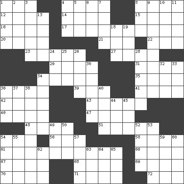 ACROSS 1. Baking dish 4. Writing tablets 8. Bowlike part 12. Jai ____ 14. Trig term 15. _ and Stitch 16. A home for chicks 17. Interpreter 20. Scram, to a cat 21. ___ good deed 22. Numbers guy (abbr.) 23. Plunders 27. Brightly colored fish 29. Travel on an animal 31. Attach a signature 34. Sea 35. Adolescent 36. Mild oath 39. Krazy ___ of comics 41. Capri or Wight 42. Exchanged or delivered for money 43. Carrier 46. Not divided or shared with others 47. Writer Wiesel 48. Taken by mouth 51. World-weariness 54. Fitting 56. Area sheltered from the wind 58. Fast planes 61. Producing rotation 66. Entreaty 67. A distinct part 68. One of the Great Lakes 69. Singe 70. At sea 71. Plant excrements 72. Three (prefix) DOWN 1. Zero-star reviews 2. Actor Baldwin 3. Rhinal 4. Pacific Standard Time (abbr.) 5. Atmosphere 6. Heredity factor (abbr.) 7. Post 8. In the manner of 9. Actors Guy, Robert Welles, and Clint 10. Hoof sound 11. Israeli folk dance 13. "Tell ____ the Marines!" 18. "Barney Miller" actor Jack 19. Pet locale 24. The grampus (Milton) 25. Make a knot 26. Neighbor of Neb. 28. Moving about 30. Related on the mother's side 32. Set 33. Compass dir. 34. More peculiar 36. Curvy letter 37. Thick or sticky substance 38. One to whom something is allotted 40. Lacquered or enameled metalware 44. Metal container 45. Car or cant ending 49. Keyboard modifier key 50. Flowery wreath 52. United States Postal Service (abbr.) 53. Small island 54. Roberta Peters solo 55. Cooking vessels 57. Nights before holidays 59. Lacerate 60. Indian skirt 62. Nursemaid (var.) 63. Epoch 64. Mouth edge 65. It is so