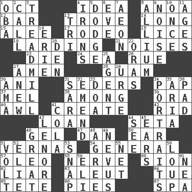 ACROSS 1. Sep. follower 4. The content of cognition 8. Small Philippine buffalo 12. Soap unit 13. Collection of objects 14. Yearn 15. Toward shelter 17. Cowboy competition 18. Louse (plural) 19. Preparing or cooking with lard 21. Annoying sounds 23. Expire 24. Ocean 26. Sorrow 27. So be it 28. Island territory of the United States 30. Cuckoo 31. Spring feasts 34. Infant food 37. Cartoonist voice _ Blanc 38. Amid 39. Mouth or opening 40. Leather borer 41. Make 42. To free from 43. Grant temporary use of 44. Stalk of a moss capsule 46. Set 47. One of the 12 tribes of Israel 50. Hearing organ 51. Actresses Bloom and Felton 54. Commissioned military rank 57. Butter sub 58. Effrontery 60. The Jewish people; Israel 62. One who doesn't tell the truth 63. Eskimo relative 64. Third day of the wk. 65. Wig 66. Sliced desserts 67. Health resort DOWN 1. Chief or king in Benin or Nigeria 2. Give a ring to 3. Excercise machine 4. Metal shackles 5. Evade 6. First lady 7. Period of immesurable duration 8. Plant genus of onion and garlic 9. Annoying sound 10. Single time 11. Grows older 13. Three (prefix) 16. One of the Great Lakes 20. Lair 22. Mouths or openings 25. Rep 27. Afresh 29. Goad 30. Housemaid (var.) 31. "Two Mules for Sister ____" 32. Make improvements or corrections to 33. ___ good deed 34. Likenesses of persons 35. Roberta Peters solo 36. Groovy apt. 41. Root beer relative 43. Poe poem 44. Observe 45. Hearing organs 46. Relatively large 48. Match 49. Congenital growth or mark on the skin 51. Electrical Unit 52. Writer Wiesel 53. Fastener 55. Fish or hair follower 56. Central Nebraska county 59. Biblical high priest 61. Teachers' org.