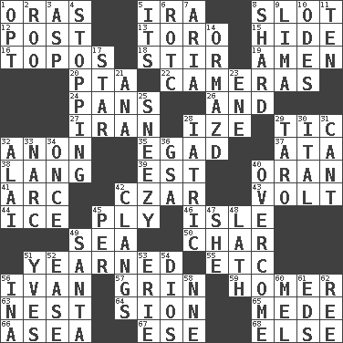 ACROSS 1. Mouths or openings 5. Lyricist Gershwin 8. Notch 12. Mail 13. "Corrida" creature 15. Flintstone garb 16. Literary convention 18. Tumult 19. So be it 20. Parent Teacher Assoc. 22. Devices for capturing images 24. Baking dishes 26. Plus 27. SW Asia republic 28. Ending with capital 29. Nervous spasm 32. Soon (poet.) 35. Mild oath 37. "One Day ___ Time" 38. Long (Scottish) 39. Eastern Standard Time (abbr.) 40. Northwest Algerian city 41. Curve 42. Russian ruler of old 43. Electrical Unit 44. Frozen water 45. Strand of rope, yarn or thread 46. Capri or Wight 49. Ocean 50. Burn to charcoal 51. Had a strong desire 55. And so on (abbr.) 56. _ the terrible 57. Broad smile 59. Home run 63. A home for chicks 64. The Jewish people; Israel 65. Ancient Persian 66. Toward the sea 67. Compass dir. 68. Otherwise DOWN 1. Choose 2. Friend of Pooh 3. Cleo's killer 4. Obstructing or blocking passage 5. ___ a Wonderful Life 6. College mil. group 7. Roberta Peters solo 8. Pottery fragment 9. Pale green bean 10. Lyric poems 11. Nine, plus one 14. Chief deity of Zoroastrianism 17. Play the lead 21. Santa ___, CA 23. Compass dir. 25. Dwarf with a sinus problem 28. Of or pertaining to medicine 29. Pacific island yam 30. Slanted text style (abbr.) 31. Patter 32. Jai ____ 33. Drug cop 34. At one time in the past 36. Girls' org. (abbr.) 40. Conquer 42. Gives out a loud, resonant sound 45. For each 47. A female animal or person 48. Thin strip of wood or metal 49. Before Barbara or Clara 51. Jacques Cousteau's middle name 52. Comfort 53. One of the Great Lakes 54. "Vaya con ____" 56. _ tizzy (2 wds.) 58. Compass dir. 60. Cartoonist voice _ Blanc 61. Begley and Asner 62. To sift