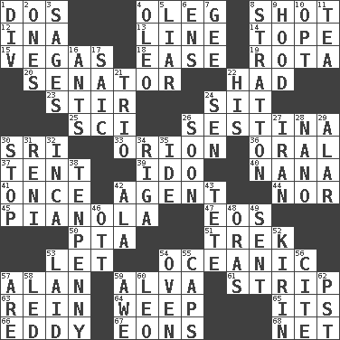 ACROSS 1. Two (Sp.) 4. Cassini of fashion 8. Guess 12. _ tizzy (2 wds.) 13. Actor's bit 14. Drink excessively 15. Viva Las _ 18. Relaxation 19. Roll call or roster of names 20. Legislator 22. Possessed 23. Disorderly outburst 24. Be seated 25. _-fi 26. French poetic form 30. _ Lanka 33. Greek mythologigal hunter 36. Relating to the mouth 37. Portable shelter 39. Wedding promise 40. Grandmother 41. At one time in the past 42. Representative 44. Not either 45. Player piano 47. Greek goddess of the dawn 50. Parent Teacher Assoc. 51. Long journey 53. Allow 54. Pertaining to the sea 57. Actor Alda or Thicke 59. Inventor's middle name 61. Empty completely 63. It's straight from the horse's mouth 64. Shed a tear 65. It is 66. Whirlpool 67. Immeasurably long periods of time 68. Fish or hair follower DOWN 1. HTML Container Element 2. Washington bills 3. Gurus 4. Butter sub 5. One who doesn't tell the truth 6. Followers of ems 7. Unit of force equal to gravity 8. Ski resort town in Vermont 9. Parka part 10. Elect 11. Afternoon social gathering 16. Pismires 17. Ketch in the Levant 21. Musical group of three 22. Part of HMS, perhaps 24. Elected rep. 26. Within a short period 27. SW Asia republic 28. Billionth: prefix 29. Having or resembling wings 30. Constrict 31. Painter Guido (1575-1642) 32. South American Indian 34. Capital of Latvia 35. Binary compound 38. 3-inch nail 42. Wing 43. False hair 46. Baseball player Mel 48. Mouths or openings 49. Posted 52. Japanese brewing company 53. Put down 54. Baking chamber 55. Balmoral and tarboosh 56. Quote 57. "We ___ not amused" (Victoria) 58. Directed 59. Deep reverence 60. Lion 62. Pacific Standard Time (abbr.)
