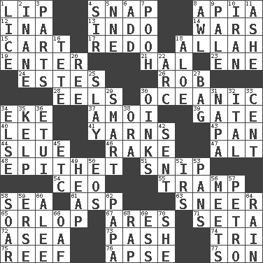 ACROSS 1. Mouth edge 4. Fastener 8. Capital of Western Samoa 12. _ tizzy (2 wds.) 13. Southeast Asian peninsula 14. Armed conflicts 15. Haul 17. Make new 18. Assad's deity 19. Keyboard key 21. Actor Linden 23. Compass dir. 24. _____ Park, CO 26. Director Reiner 28. Snakelike fish 30. Pertaining to the sea 34. Supplement with great effort 37. Mine, in Marseilles 39. Yard entry 40. Allow 41. Entertaining tales 43. Baking dish 44. Turn sharply 46. Libertine 47. The first octave above the treble staff 48. Curse 51. Sever or remove by pinching or nipping 54. Corporate head (abbr.) 55. _____ steamer (cargo ship) 58. Ocean 61. Cleo's killer 63. Contemptuous expression 65. Fourth or lowest deck 67. Ancient Greek god of war 71. Stalk of a moss capsule 72. At sea 73. Romantic infatuation 74. Three (prefix) 75. Coral ridge 76. Domed church section 77. Manchild DOWN 1. Louse (plural) 2. Empty; void 3. Actors' quests 4. Title for a knight 5. Compass dir. 6. Increase 7. "Silly old bear" 8. Leather borer 9. Light colored 10. SW Asia republic 11. American tennis player Robert 16. False hair 18. _ vera 20. To sift 22. Curve 25. Kill 27. Container for groceries 29. Don Adams' spy role 30. Pig sounds 31. California wine valley 32. Slanted text style (abbr.) 33. Penny 34. Otherwise 35. Seaweed 36. Needle holder 38. Mouth or opening 42. Posted 45. And so on (abbr.) 49. Pile 50. Greek goddess of the dawn 52. Big collection agency 53. Zero-star reviews 56. Confronts 57. Stone: prefix 58. Fly high 59. Celtic language 60. Toward shelter 62. Dad 64. Precipitation 66. Clumsy lout 68. Reproach for some lapse or misdeed 69. Double-curved letter 70. A female animal or person