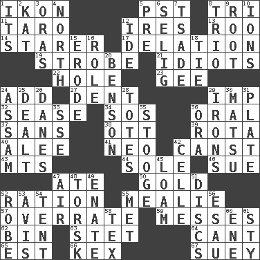 ACROSS 1. Image 5. Pacific Standard Time (abbr.) 8. Three (prefix) 11. Edible starchy tuberous root 12. Angers 13. Friend of Pooh 14. A viewer who gazes fixedly 17. Accusation by an informer 19. Disco prop 21. Foolish or stupid persons 22. Opening into or through something 23. Turn to the right 24. Say or write further 27. Undesirable depression on a surface 29. Naughty child 32. Gospel singer Marvin 34. Mayday 36. Relating to the mouth 37. Without 38. Baseball player Mel 39. Round or rotation of duties 40. Toward shelter 41. Modern: prefix 42. 2nd pers. sing. pres. of can (arch.) 43. Mountains (abbr.) 44. Not divided or shared with others 46. Institute legal proceedings 47. Had dinner 50. Aureate 52. Food allowance for one day 55. Ear of corn 57. Make much ado about nothing 59. Makes clutter 62. Storage container 63. Proofreading order 64. Patter 65. Eastern Standard Time (abbr.) 66. A weed 67. Chop _ DOWN 1. It is 2. Krazy ___ of comics 3. Mouths or openings 4. Compass direction 5. Before (prefix) 6. Major League Baseball Commissioner Bud 7. Sadhe (variant) 8. Musical group of three 9. Carrot, for example 10. Charged particles 12. Binary compound 15. Wear away 16. Hero or heavy, e.g. 18. Standoff 20. Gillaume's butler role 24. Indian state 25. Started a card game 26. Natives or inhabitants of Denmark 28. Lugs 29. Metal shackles 30. Taiwanese island in East China Sea 31. Food holder 33. Compass dir. 35. Moe Howard, for one 36. Mouth or opening 42. Cell (Danish) 45. Rich soil 47. Atmosphere 48. Cod relative 49. Maternal 51. Flat circles 52. Loose flowing garment 53. Advice 54. Portable shelter 55. Was introduced to 56. He sold his birthright 58. John Ritter's dad 60. Compass dir. 61. Filthy place