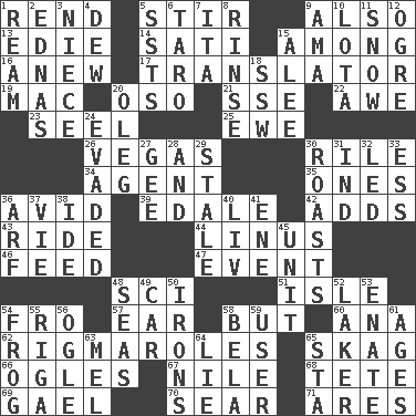 ACROSS 1. Tear apart 5. Use a swizzle stick 9. In addition 13. Singer Brickell 14. Suttee (variant) 15. Amid 16. Afresh 17. Interpreter 19. Big _ 20. Bear (Spanish) 21. Compass dir. 22. Deep reverence 23. Sew up the eyelids of hawks and falcons 25. She-sheep 26. Viva Las _ 30. Cause heat under the collar 34. Representative 35. Singles 36. Enthusiastic 39. Peak District village in England 42. Sums up 43. Travel on or in a vehicle 44. "_ and Lucy" (Charlie Brown theme song) 46. Nourish 47. Incident 48. _-fi 51. Capri or Wight 54. Back 57. Hearing organ 58. Yet 60. Santa ___, CA 62. Frustrating wastes of time 65. Heroin 66. Stares 67. Mediterranean tributary 68. False hair 69. Highlander 70. Dry up 71. Ancient Greek god of war DOWN 1. 480, 500 or 516 sheets of paper 2. Ferber et al. 3. Sibling's daughter 4. Morning condensation 5. Fast planes 6. Pacific island yam 7. Call ___ day 8. Wash lightly 9. Nanny (var.) 10. Globular water bottle used in Asia 11. Frozen precipitation 12. Legendary monster 15. Toward shelter 18. Compass dir. 20. Cassini of fashion 24. Eluded 27. Turn to the right 28. Added to 29. Lacking originality or spontaneity 30. Exposes to great heat 31. Indiana (abbr.) 32. Directed 33. Double-curved letter 36. Sandy's bark 37. Compete 38. Binary compound 40. 54 in ancient Rome 41. Compass dir. 45. A single undivided whole 48. Oceans 49. Auto 50. Metal shackles 52. Member of a famous L.A. basketball team 53. Related on the mother's side 54. Tree-dwelling hopper 55. Port city in Latvia 56. Stare 58. Actor Lugosi 59. One who makes use of a thing 61. Grows older 63. Cartoonist voice _ Blanc 64. Whopper 65. R.R. building