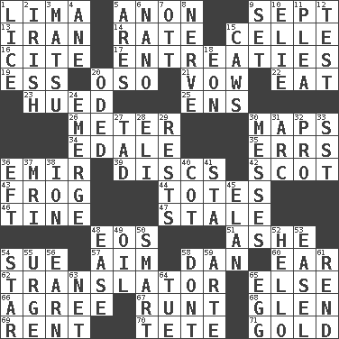 ACROSS 1. Pale green bean 5. At once, immediately (arch.) 9. Back-to-school mo. 13. SW Asia republic 14. Pace 15. Cell (Danish) 16. Quote 17. Pleas 19. Double-curved letter 20. Bear (Spanish) 21. Solemn pledge 22. Consume 23. Took on color 25. Followers of ems 26. Distance measurement 30. Atlas contents 34. Peak District village in England 35. Blunders 36. Arab leader 39. Plates 42. Highlander 43. Tree-dwelling hopper 44. Hauls 46. Prong on a fork 47. Having lost freshness 48. Greek goddess of the dawn 51. American tennis player Robert 54. Institute legal proceedings 57. Direct toward a target or goal 58. Daniel's nick name 60. Ewer handle 62. Interpreter 65. Otherwise 66. Match 67. The smallest animal of a litter 68. Small, secluded valley 69. Monthly bill 70. Wig 71. Precious metal DOWN 1. Louse (plural) 2. From or relating to Ireland 3. Taiwanese island in East China Sea 4. A saturated hydrocarbon 5. Ancient Greek god of war 6. Billionth: prefix 7. Baseball player Mel 8. Impudent aggressiveness 9. Put into a specified state 10. Writer Wiesel 11. Entreaty 12. Trial 15. Crow sounds 18. Period of immesurable duration 20. Wrote a lyric poem 24. Develop 27. Bit 28. Connecticut Ivy Leaguer 29. Musical pauses 30. Makes clutter 31. Curve 32. Adept person 33. Fast jet (abbr.) 36. Newt 37. Medical imaging device (abbr.) 38. Electrically charged atom 40. Small bed 41. R.R. building 45. Style 48. Comfort 49. Lubricate 50. Don Adams' spy role 52. Phone greeting 53. Artist's stand 54. Play the lead 55. Goad 56. Merit 58. Do not 59. Johnson of "Laugh-In" 61. Tear apart 63. Fish or hair follower 64. Third day of the wk. 65. Ovum