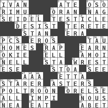 ACROSS 1. "Terrible" tsar 5. Had dinner 8. Bear (Spanish) 11. Tall New Zealand timber tree 12. Northwest Algerian city 13. Tired old horse 14. A glass for beer 17. A testis 19. Cease 21. Cigar-shaped 22. Comedian Laurel of Laurel & Hardy 23. Epoch 24. Personal Computers (abbr.) 27. Greek god of love 29. The 19th letter of the Greek alphabet 32. Dwellings 34. Hit sharply and swiftly 36. Merit 37. Migrant worker of the '30s 38. Pipe bend 39. Mine, in Marseilles 40. 1994 drama film starring Jodie Foster 41. R.R. building 42. Obtain by seizing forcibly or violently 43. Compass dir. 44. Portico 46. Observe 47. American Automobile Association (abbr.) 50. Singer James 52. A viewer who gazes fixedly 55. Michaelmas daisies 57. Coward 59. Threatening words 62. 100% 63. Body of Kaffir warriors 64. Good sense 65. Teachers' org. 66. Erode 67. Collude with DOWN 1. Big collection agency 2. Compete 3. Among 4. Unadorned figures 5. "We ___ not amused" (Victoria) 6. Clothes sense 7. Keyboard key 8. Single time 9. Table seasoning 10. Double curve, resembling the letter S 12. Baseball player Mel 15. _____ Park, CO 16. One who doesn't tell the truth 18. Lyricist Gershwin 20. Sounds asleep 24. Give a jingle 25. Popular sodas 26. Grin 28. Table seasonings 29. Domesticates 30. Came up 31. Join together 33. Snakelike fish 35. Food holders 36. Ewer handle 42. Wetness 45. "Beetle Bailey" pooch 47. Tate display 48. Nest on high 49. Scent 51. Sports stadium 52. Connect, as a bridge 53. Lacquered or enameled metalware 54. Silent film actress Nazimova 55. Black tropical American cuckoo 56. Oscar Madison type 58. Elect 60. Institute legal proceedings 61. Eastern Standard Time (abbr.)
