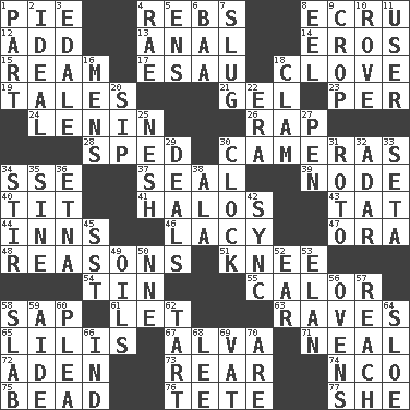 ACROSS 1. Sliced dessert 4. Confederate soldiers (slang) 8. Shade of tan 12. Increase 13. Of or related to the anus 14. Greek god of love 15. 480, 500 or 516 sheets of paper 17. He sold his birthright 18. Garlic unit 19. Falsehoods 21. Set 23. For each 24. Soviet premier 1918-24 26. Hit sharply and swiftly 28. Hurried 30. Devices for capturing images 34. Compass dir. 37. Lick closed 39. Thickened enlargement 40. Teat (slang) 41. Radiant circles of light 43. Make lace 44. Lodging establishments 46. Made of lace 47. Mouth or opening 48. Thinks logically 51. Leg joint 54. Shallow baking pan 55. Bodily heat indicating an inflammation 58. Plant excrement 61. Allow 63. All-night dance parties 65. Ms. Damita and namesakes 67. Inventor's middle name 71. Anneal 72. Arabian gulf 73. Stern 74. Non-commissioned officer (abbr.) 75. Necklace unit 76. False hair 77. A female animal or person DOWN 1. Component 2. Perfect 3. Peak District village in England 4. Actress Charlotte 5. Followers of ems 6. Sound made by sheep 7. A hard, heavy blow 8. Snakelike fish 9. Riding implement 10. Be footloose 11. One who makes use of a thing 16. Not women's 18. Dollar (slang) 20. Small drink 22. Epoch 25. Tender 27. Writing instrument 29. Allots cards 30. Timepiece 31. Printing process, for short 32. The sixth month of the Jewish calendar 33. Stalk of a moss capsule 34. Disorderly outburst 35. Trig term 36. Inactive volcano in Sicily 38. In the manner of 42. Synchronize (abbr.) 45. Fast jet (abbr.) 49. Petroleums 50. Compass dir. 52. Ewer handle 53. Enthusiasm 56. Baking chambers 57. Arrive at 58. Broad, flat, thick piece 59. Assistant 60. Entreaty 62. Small pie 64. _ gin 66. Working for oneself (abbr.) 68. Area sheltered from the wind 69. Large container 70. "We ___ not amused" (Victoria)
