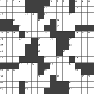 ACROSS 1. Sew up the eyelids of hawks and falcons 5. Had dinner 8. Often (poetically) 11. Inventor's middle name 12. The Jewish people; Israel 13. Three (prefix) 14. Parts 17. Ski resort town in Vermont 19. Manatee 21. Moe Howard, for one 22. Play the lead 23. Cask 24. Greek goddess of the dawn 27. Inside; within (prefix) 29. Opposite of masc. 32. Smooth fabric 34. Epoch 36. Otherwise 37. Russian ruler of old 38. Direct toward a target or goal 39. Globular water bottle used in Asia 40. Snakelike fish 41. Trim (branches) 42. NE Netherlands city 43. Compass dir. 44. 1994 drama film starring Jodie Foster 46. Fast jet (abbr.) 47. Reproach for some lapse or misdeed 50. 480, 500 or 516 sheets of paper 52. Prior to 55. Gossips 57. One to whom something is allotted 59. Keyboard key 62. Cards in a Roman deck? 63. Angers 64. (Had) reclined 65. Was introduced to 66. A really long time 67. Downhill vehicle DOWN 1. Plant excrement 2. Connecticut Ivy Leaguer 3. Nights before holidays 4. Shoestrings 5. Small island 6. Cod relative 7. Maternal 8. "Beetle Bailey" pooch 9. Tree-dwelling hopper 10. Prong on a fork 12. Compass dir. 15. Consumed 16. Glance over 18. Coat; cloak 20. Severe or trying experience 24. First name in cosmetics 25. Fertile tracts in a desert 26. Lacking originality or spontaneity 28. Greek mythologigal hunter 29. Soft thread for cleaning between teeth 30. _____ Park, CO 31. Intended 33. Big collection agency 35. Electrical Unit 36. Raised railways 42. Having winglike extensions 45. Grant temporary use of 47. Friend of Pooh 48. Nick name for Arthur 49. Stone: prefix 51. Shopping centers 52. Lip ointment 53. Writer Wiesel 54. Secret move to avoid paying debts 55. It is so 56. Lick closed 58. Car or cant ending 60. Make a knot 61. Conclude