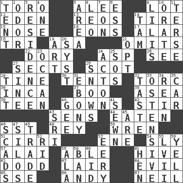 ACROSS 1. "Corrida" creature 5. Toward shelter 9. Car dealer's back yard 12. Genesis locale 13. Vintage cars 14. Become fatigued 15. Sense of smell 16. Immeasurably long periods of time 17. Having or resembling wings 18. Three (prefix) 19. White ___ sheet 21. Leaves out 22. Dinghy 24. Cleo's killer 26. Perceive with the eye 27. Religious groups 28. Highlander 29. Prong on a fork 30. Portable shelters 32. Torque (variant) 36. South American Indian 37. Oct. 31 cry 38. Toward the sea 39. Adolescent 40. Long dresses 42. Agitate 43. Elected reps. 44. Eroded 46. Fast jet (abbr.) 49. Marina Del _, California 50. Songbird 51. High-altitude cloud 53. Compass dir. 54. Cunning 57. Mountain range southwest of Kyrgyzstan 58. Competent 61. Hub of activity 62. Texas town _ City 63. Den 64. Tending to cause great harm 65. Compass dir. 66. Actor Griffith 67. Famous astronaut Armstrong DOWN 1. Portable shelter 2. Aroma 3. Home 4. Single 5. Type of rug 6. Lion 7. Period of immesurable duration 8. Double-curved letter 9. Ms. Damita and namesakes 10. Speak pompously 11. Laconic 14. Scottish cap 19. Nonscientific branch of learning 20. System (abbr.) 21. Elect 23. Sea 24. NE Massachussets city 25. Distress signal 27. Trig term 28. Overwhelms 29. Teat (slang) 31. Dark wood 32. Clothes sense 33. Clearly or manifestly demonstrative 34. It's straight from the horse's mouth 35. 4-wheeled motor vehicle 40. Unit of force equal to gravity 41. Stitched 43. _ Lanka 45. "We ___ not amused" (Victoria) 46. Tons 47. Grain storage towers 48. Buy and sell 52. To free from 53. Suggestive of the supernatural 55. 57 in ancient Rome 56. Shout 58. According to 59. Bar 60. Flaplike covering 61. Layer