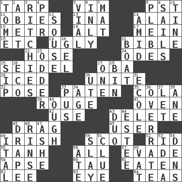 ACROSS 1. Canvas cover 5. Zeal 8. Pacific Standard Time (abbr.) 11. Off-Broadway awards 13. _ tizzy (2 wds.) 14. Jai ____ 15. Paris' subway 16. Keyboard modifier key 17. Count _ (2 wds.) 18. And so on (abbr.) 19. Unsightly 21. Instruction Manual for Humans 22. Flexible conduit 24. Lyric poems 25. A glass for beer 27. Chief or king in Benin or Nigeria 29. On the rocks 30. Join together 32. Airs 33. Eucharist need 35. Root beer relative 39. Makeup applied to the cheeks 41. Baking chamber 42. Purpose 43. Keyboard key 45. To trail on the ground 48. One who uses or employs something 49. From or relating to Ireland 50. Native of Scotland 52. To free from 55. Hyperbolic tangent 56. 100% 57. Elude 59. Domed church section 60. The 19th letter of the Greek alphabet 61. Ingested 62. Area sheltered from the wind 63. Sight organ 64. Beverages made from leaves DOWN 1. Heavy book 2. Collude with 3. Actors Guy, Robert Welles, and Clint 4. For each 5. Small bottle 6. Inwardly 7. Floor protector 8. Military trainee 9. Moves on water 10. Prong on a fork 12. Lush 14. Among 20. Set 21. Water vessel 23. More peculiar 25. Small drink 26. Environmental prefix 27. Single 28. Storage container 30. Shoshoni 31. Learning spot: Fr. 33. Product of festering 34. Personal question 36. Make much ado about nothing 37. Allow 38. A saturated hydrocarbon 40. Ending for "Through" and "Enough" 43. Superhero pair 44. First name in cosmetics 45. Window treatment 46. Wash lightly 47. American tennis player Robert 49. Slanted text style (abbr.) 50. Kill 51. A slight indication 53. The content of cognition 54. Hiding places for outlaws 56. Had dinner 58. Large container