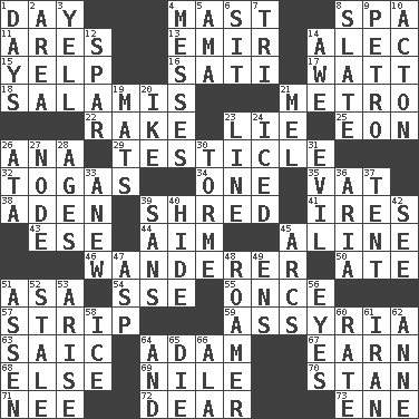 ACROSS 1. 24 hours 4. Vertical spar for supporting sails 8. Health resort 11. Ancient Greek god of war 13. Independent ruler or chieftain 14. Actor Baldwin 15. Sharp bark 16. Suttee (variant) 17. Electrical Unit 18. Deli grouping 21. Paris' subway 22. Immoral or dissolute person 23. Falsehood 25. A really long time 26. Santa ___, CA 29. A testis 32. Ancient Roman robes 34. Single 35. Large container 38. An important port of Yemen 39. Tear up 41. Angers 43. Compass dir. 44. Direct toward a target or goal 45. Place in a line 46. Nomad 50. Had dinner 51. White ___ sheet 54. Compass dir. 55. At one time in the past 57. Long narrow piece of something 59. Nineveh was its capital 63. Ketch in the Levant 64. First of billions? 67. Merit 68. Otherwise 69. The longest river in the world 70. Comedian Laurel of Laurel & Hardy 71. Born 72. Letter starter 73. Compass dir. DOWN 1. 24-hour periods 2. Type of rug 3. Shout 4. Makes clutter 5. Nursemaid (var.) 6. Be seated 7. Three (prefix) 8. Chalkboard 9. Stone: prefix 10. 13-14th century defensive garment 12. Coast Guard woman 14. Deep reverence 19. Floor coverings 20. Mamie's husband 21. Cartoonist voice _ Blanc 23. Actor's bit 24. On the rocks 26. "One Day ___ Time" 27. Thickened enlargement 28. Ripens 30. Singer Mel 31. Tending to cause great harm 33. Afresh 36. Roberta Peters solo 37. Portable shelter 39. Without 40. Flintstone garb 42. Perceive with the eye 45. Curves 47. Cleo's killer 48. Nomad 49. Followers of ems 51. NE Netherlands city 52. Showing deterioration from age 53. Get up 56. Sight organs 58. Frozen water 60. Assign a rank or rating to 61. SW Asia republic 62. Queen of England 1702-14 64. Also 65. Pass on 66. In the manner of