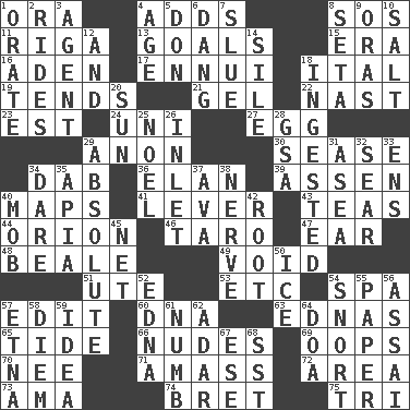 ACROSS 1. Mouth or opening 4. Sums up 8. Mayday 11. Capital of Latvia 13. Finish lines 15. Period 16. An important port of Yemen 17. World-weariness 18. Slanted text style (abbr.) 19. Looks after 21. Set 22. Political cartoonist Thomas 23. Eastern Standard Time (abbr.) 24. Single; one (prefix) 27. Oval reproductive body of a fowl 29. Soon (poet.) 30. Gospel singer Marvin 34. Apply (a substance) by light strokes 36. Flair 39. NE Netherlands city 40. Atlas contents 41. Prying instrument 43. Afternoon social gatherings 44. Constellation of myth 46. Pacific island yam 47. Hearing organ 48. Calif. Air Force Base 49. Null 51. Shoshoni 53. And so on (abbr.) 54. Health resort 57. Prepare for publication 60. Heredity factor (abbr.) 63. Ferber et al. 65. Event that recurs at intervals 66. Unclothed pictures 69. I made a mistake 70. Born 71. Collect or gather 72. Type of rug 73. Nursemaid (var.) 74. Cy Young winner Saberhagen 75. Three (prefix) DOWN 1. Speak pompously 2. Amusement-park features 3. Rep 4. Mature 5. Spanish title 6. Mild oath, euphamism for damn 7. Turn sharply 8. Stalk of a moss capsule 9. Mouths or openings 10. Table seasoning 12. Plus 14. Drop; flow; fall 18. Eaten 20. Player for Phoenix 25. Christmas carol 26. An arm off of a larger body of water 28. Girls' org. (abbr.) 29. Utter; complete 31. Toward the sea 32. Dry up 33. Followers of ems 34. Have the gumption 35. Capital of Western Samoa 37. Actress Gardner 38. Boldness 40. Disorderly crowd 42. Carrot, for example 45. Fish or hair follower 50. Frozen water 52. Pulitzer Prize-winning author Ferber 54. Derisive sound 55. Some stationery 56. Slender Brazilian palm 57. Inactive volcano in Sicily 58. South Vietnam president (1954) 59. It may be bright or harebrained 61. Unfeeling 62. The sixth month of the Jewish calendar 64. ___ good deed 67. Compass dir. 68. Fast jet (abbr.)