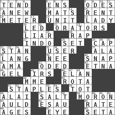 ACROSS 1. Look after 5. Followers of ems 8. Lyric poems 12. Afresh 13. Floor protectors 15. Monthly bill 16. Distance measurement 18. A single undivided whole 19. Kenny Rogers chart-topper in '80 20. Directed 22. Speakers 24. One who doesn't tell the truth 26. Strike 27. _ china 28. Arrange properly for use 29. Head covering 32. Comedian Laurel of Laurel & Hardy 35. One who makes use of a thing 37. In the manner of 38. Long (Scottish) 39. Born 40. Fastener 41. Nanny (var.) 42. Wrote a lyric poem 43. Inactive volcano in Sicily 44. Set 45. Big collection agency 46. Liveliness 49. Madame (abbr.) 50. Round or rotation of duties 51. Paper fasteners 55. Small child 56. Mountain range southwest of Kyrgyzstan 57. Table seasoning 59. Person of subnormal intelligence 63. Old (Scot.) 64. Son of Isaac 65. Pace 66. Eons 67. Sight organ 68. Bristle DOWN 1. Scottish cap 2. Compass dir. 3. Fish or hair follower 4. Residence 5. Australian flightless bird 6. Billionth: prefix 7. Commotion 8. Fourth or lowest deck 9. Letter starter 10. Conclusions 11. Filthy place 14. A viewer who gazes fixedly 17. It's straight from the horse's mouth 21. June honoree 23. Make lace 25. Periods in a boxing match 28. Sowing specialist 29. Patter 30. Actor Alda or Thicke 31. Dad 32. Volcanic refuse 33. Not wild 34. Of or related to the anus 36. Observe 40. Legislators 42. Threatening words 45. Naughty child 47. Car dealer's back yard 48. Tiny particle 49. Unmarried girls 51. Strike heavily 52. Story 53. Comfort 54. Kill 56. Auto club (abbr.) 58. Third day of the wk. 60. Actress Charlotte 61. Baseball player Mel 62. Teachers' org.