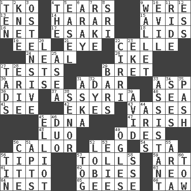 ACROSS 1. Ring climax 4. Separates forcefully 9. Past tense of be (plural) 13. Followers of ems 14. Ethiopian city, capital of Harari 15. Deliberation 16. Remaining after all deductions 17. 1973 Nobel Price Winner (Physics) Leo 18. Flaplike coverings 19. Snakelike fish 21. Sight organ 22. Cell (Danish) 24. Actress Patricia 26. Mamie's husband 27. Trials 29. Cy Young winner Saberhagen 30. Originate 31. The sixth month of the Jewish calendar 33. Viper 36. HTML Container Element 37. Nineveh was its capital 40. Ocean 41. Perceive with the eye 42. Supplements with great effort 43. Flower holders 45. Pulitzer Prize-winning author Ferber 47. From or relating to Ireland 48. Nilotic language 49. Lyric poems 50. Bodily heat indicating an inflammation 52. Part of a journey 54. R.R. building 56. Native american tent (variation) 57. For Whom the Bell _____ 59. Nonscientific branch of learning 61. "Tell ____ the Marines!" 62. Off-Broadway awards 63. Modern: prefix 64. Egg locale 65. Honkers 66. The 23rd letter of the Hebrew alphabet DOWN 1. "___ Little Indians" 2. Leg joint 3. Clearly or manifestly demonstrative 4. Definite Article 5. Artist's stand 6. Like ___ of sunshine 7. Immoral or dissolute person 8. Indian title of respect (Mr.) 9. Place for singles 10. Morally bad or wrong 11. Travel on or in a vehicle 12. Double-curved letter 20. Allows 22. High-altitude cloud 23. Supplement with great effort 25. Toward the sea 27. Small amounts or degrees 28. 4th largest of the Great Lakes 29. Soap units 31. "____ silly question..." 32. Color 33. Helper 34. Perceives with the eye 35. Romantic infatuation 38. Sir (Sp.) 39. Enthusiastic 44. Ancient Greek god of war 45. American author Paul (1891-1958) 46. Superhero pair 49. Stares 50. Quote 51. Tenement units (abbr.) 52. Ear part 53. Writer Wiesel 55. Type of rug 56. Shallow baking pan 57. Coat; cloak 58. Compass dir. 60. Pull behind