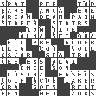 ACROSS 1. Argument over a trivial matter 5. For each 8. Bit 11. Hearing organs 12. Small Philippine buffalo 14. Night before a holiday 15. Believer in; advocate of (suffix) 17. Letter starter 18. Ache 19. A viewer who gazes fixedly 21. Flight of steps 23. Electrically charged atom 25. Hoop that covers a wheel 26. _ mater 27. Perceive with the eye 28. Chief or king in Benin or Nigeria 31. Pipe bend 33. Before (prefix) 35. Tree or shrub in the Birch family 37. 154 in Roman numerals 38. Small bed 40. Grand slam 41. Motion picture award 43. Ocean 45. Lyricist Gershwin 46. Unit of force equal to gravity 47. Curvy letter 50. Jai ____ 52. At one time in the past 53. Boy, to dad 54. A period of five years 56. Artist's stands 61. _ course 62. 43,560 square feet 65. Member of a famous L.A. basketball team 66. Mouth or opening 67. Travels 68. Painter Guido (1575-1642) 69. Fenced enclosure 70. Dripping 71. Sums up DOWN 1. Oceans 2. Role in a play 3. Operatic vocal solo 4. Russian ruler of old 5. Groovy apt. 6. Compass dir. 7. Ridicules or criticizes harshly 8. Separate forcefully 9. Deliberation 10. Lair 13. Nick name for Arthur 16. Famous astronaut Armstrong 18. Sliced dessert 20. Play 22. Length times width 24. Drug cop 26. Inventor's middle name 28. Aroma 29. Actor Lugosi 30. "We ___ not amused" (Victoria) 31. Otherwise 32. Louse (plural) 34. Greek goddess of the dawn 36. 57 in ancient Rome 37. Gear tooth 39. Afternoon social gatherings 42. Monthly bill 44. Medicinal plant 48. Strangle with an iron collar 49. Manatee 51. Of or related to the anus 52. Order of Saint Francis (abbr.) 54. Old wives' tales, e.g. 55. ____ Bator 57. "Two Mules for Sister ____" 58. Made supply last 59. Grant temporary use of 60. Indian titles of respect 61. Republican Party 63. Portuguese money of account (variant) 64. Eastern Standard Time (abbr.)