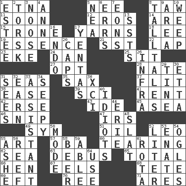 ACROSS 1. Inactive volcano in Sicily 5. Born 8. The 23rd letter of the Hebrew alphabet 11. Within a short period 12. Greek god of love 14. "We ___ not amused" (Victoria) 15. Marketplace scale 17. Entertaining tales 18. Area sheltered from the wind 19. Substance 21. Fast jet (abbr.) 22. Pet locale 23. Make supply last 24. One of the 12 tribes of Israel 25. Be seated 27. Elect 28. Nathan's nickname 31. Oceans 35. Saxophone 37. Sudden quick movement 38. Relaxation 39. _-fi 41. Monthly bill 42. Celtic language 43. Binary compound 45. Toward the sea 46. Clip 47. Big collection agency 49. Symbol (abbr.) 51. Lubricate 52. Lion 55. Tate display 57. Chief or king in Benin or Nigeria 60. Pulling into pieces 62. Ocean 63. To get out of a bus 65. Add up to 66. Layer 67. Snakelike fish 68. Wig 69. Lizard (obsolete) 70. To riddle 71. Ancient Greek god of war DOWN 1. First name in cosmetics 2. Cod relative 3. Trap for birds or small mammals 4. Singer Murray 5. Teachers' org. 6. Blunders 7. Immeasurably long periods of time 8. Baron Munchausen's specialties 9. Length times width 10. Shed a tear 13. Fast planes 16. Inside; within (prefix) 17. Gossips 20. Smile enhancers 26. Kind of red light 29. Prong on a fork 30. Singer James 31. Perceives with the eye 32. Merit 33. Helper 34. Oozy 36. One more than ninety 40. Foolish or stupid persons 44. 4th largest of the Great Lakes 48. Narrow board 50. Method 52. 61 cubic inches 53. Maternal 54. Stares at amorously 55. American tennis player Robert 56. Coral ridge 58. Fermented drink made from hops 59. Competent 61. Round or rotation of duties 64. Purpose