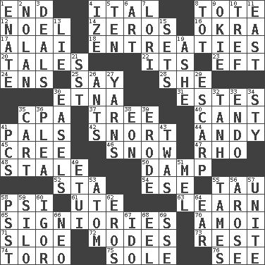 ACROSS 1. Conclusion 4. Slanted text style (abbr.) 8. Carry 12. Christmas carol 14. Nothings 16. Gumbo ingredient 17. Jai _ 18. Pleas 20. Falsehoods 22. ___ a Wonderful Life 23. Lizard (obsolete) 24. Followers of ems 25. Declare 28. A female animal or person 30. Inactive volcano in Sicily 31. _____ Park, CO 35. Numbers guy (abbr.) 37. Family _ (genealogy) 40. Patter 41. Friends 42. Derisive sound 44. Actor Griffith 45. Algonquian 46. Frozen precipitation 47. 17th letter of the Greek alphabet 48. Lacking originality or spontaneity 50. Moist 52. R.R. building 54. Compass dir. 55. The 19th letter of the Greek alphabet 58. 23rd letter of the Greek alphabet 61. Shoshoni 63. Acquire or gain knowledge or skills 65. Seigniories (variant) 70. Mine, in Marseilles 71. _ gin 72. Methods 73. Take ten 74. "Corrida" creature 75. Flatfish 76. Observe DOWN 1. Related on the mother's side 2. Pitcher Ryan 3. Allots cards 4. Ending with capital 5. Nine, plus one 6. Nonscientific branch of learning 7. Australian parrot (variant) 8. Small child 9. Migrant worker of the '30s 10. Unclean, religiously 11. Compass direction 13. Falsehood 15. Puts into a specified state 19. American tennis player Robert 21. Fast jet (abbr.) 26. Pismires 27. Entertaining tales 29. Fortification 30. Artist's stands 32. Hyperbolic tangent 33. Inside; within (prefix) 34. Filthy place 35. Haul 36. Entreaty 38. Period of immesurable duration 39. Wear away 41. Personal Computers (abbr.) 43. It was, poetically 49. Needle case 51. Cartoonist voice _ Blanc 53. Smallest unit of an element 55. Domesticates 56. Came up 57. Join together 58. Inconspicuous attention getter 59. Grain storage tower 60. Russian composer Stravinsky 62. Greek god of love 64. Hearing organ 66. Modern: prefix 67. Wedding promise 68. Snakelike fish 69. Compass dir.