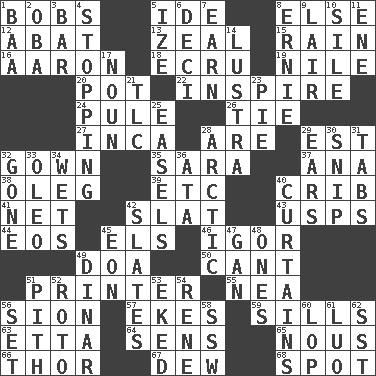 ACROSS 1. Moves up and down 5. Binary compound 8. Otherwise 12. Blind as ____ 13. Ardor 15. Water falling in drops from the sky 16. Composer Copland 18. Shade of tan 19. Mediterranean tributary 20. Plant holder 22. Stimulate to action 24. Whimper 26. Make a knot 27. South American Indian 28. "We ___ not amused" (Victoria) 29. Eastern Standard Time (abbr.) 32. Woman's formal wear 35. "Two Mules for Sister ____" 37. Santa ___, CA 38. Cassini of fashion 39. And so on (abbr.) 40. Baby bed with high sides 41. Fish or hair follower 42. Narrow board 43. United States Postal Service (abbr.) 44. Greek goddess of the dawn 45. Raised railways 46. Composer Stravinsky 49. ___ good deed 50. Patter 51. Hard copy producer 55. Teachers' org. 56. The Jewish people; Israel 57. Makes supply last 59. Beverly of Met fame 63. Singer James 64. Elected reps. 65. Good sense 66. Son of Odin 67. Morning condensation 68. Blemish DOWN 1. Sound made by sheep 2. Chief or king in Benin or Nigeria 3. Long, evenly shaped piece 4. Constricting 5. Ending with capital 6. Tenth: prefix 7. Merit 8. Bert's buddy 9. Den 10. Drop; flow; fall 11. Compass dir. 14. A period of five years 17. Part of speech 21. Affectionate concern, for short 23. Sliced dessert 25. Artist's stands 28. Northern region 29. Hearing organs 30. Sever or remove by pinching or nipping 31. Bar bills 32. Went 33. Butter sub 34. Moistens 36. "One Day ___ Time" 40. Window treatments 42. Chalkboards 45. A really long time 47. Separate the seeds from cotton 48. Washington bills 49. Middle Eastern gold or silver currency 51. Heart or essence 52. Printing process, for short 53. Made supply last 54. French philosopher Descartes 56. Put into a specified state 58. Compass dir. 60. Chop off 61. Nilotic language 62. Fast jet (abbr.)