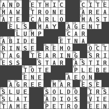 ACROSS 1. Also 4. Value system 9. Quote 13. Opening into something insatiable 14. Heavy duty weighing machine 15. Type of rug 16. Had dinner 17. Monte _, Las Vegas Hotel/Casino 18. Vertical spar for supporting sails 19. Raised railways 21. Fifth month 22. Rep 24. Mass 26. Automobile 27. Stay 29. Inactive volcano in Sicily 30. Wash lightly 31. San ____ (Riviera town) 33. Sep. follower 36. Label 37. Pulling into pieces 40. _ Lanka 41. Curvy letter 42. Play the lead 43. Being in motion 45. Carry 47. First-year military academy student 48. Compass dir. 49. Period of immesurable duration 50. Match 52. Spoil 54. Compass dir. 56. Turn sharply 57. Twentieth part of a lira 59. Big collection agency 61. Narrow board 62. Goodbye (Sp.) 63. Compete 64. Not wild 65. Stone: prefix 66. Car or cant ending DOWN 1. Wet nurse (var.) 2. Nathan's nickname 3. Homes 4. And so on (abbr.) 5. _____ steamer (cargo ship) 6. Israeli folk dance 7. In an inward manner 8. Corporate head (abbr.) 9. Device for capturing images 10. SW Asia republic 11. Trial 12. Ingest 20. Beer foam 22. NE Massachussets city 23. Separate the seeds from cotton 25. Rendezvous 27. Johnson of "Laugh-In" 28. Prejudice 29. Arab leader 31. Assign a rank or rating to 32. Epoch 33. Clearly or manifestly demonstrative 34. Baby bed with high sides 35. Hoop that covers a wheel 38. First name in cosmetics 39. Stare wonderingly 44. A type of plum 45. Cigar-shaped 46. Single 49. Zeal 50. Silent film actress Nazimova 51. Island territory of the United States 52. Method 53. Came down and settled, as after flight 55. 4th largest of the Great Lakes 56. Fast jet (abbr.) 57. Plant excrement 58. Bear (Spanish) 60. Elected rep.