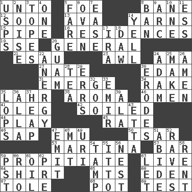 ACROSS 1. To (old English) 5. Enemy 8. Object of repulsion 12. Within a short period 13. Actress Gardner 14. Entertaining tales 15. Corncob 16. Homes 19. Compass dir. 20. Commissioned military rank 21. He sold his birthright 23. Leather borer 24. Nanny (var.) 27. Nathan's nickname 30. Dutch treat 31. Develop 34. Immoral or dissolute person 35. Cowardly lion portrayer 38. Scent 40. Sign of something about to happen 41. Cassini of fashion 42. Dirtied 44. Romp 45. Pace 46. Plant excrement 47. Australian flightless bird 50. Russian ruler of old 53. Chrissie's court nemesis 57. Soap unit 59. Appease 63. Moving, as bait 64. Chest covering 65. Mountains (abbr.) 66. Genesis locale 67. Lacquered or enameled metalware 68. Plant holder 69. Trial DOWN 1. United States Postal Service (abbr.) 2. Annoying sound 3. Drinks excessively 4. Single 5. Conductor's collection 6. Baking chamber 7. Comfort 8. Bar 9. Curve 10. Compass dir. 11. Double-curved letter 14. Shout 17. Lyricist Gershwin 18. Fool 20. Island territory of the United States 22. Disorder of the immune system 24. First of billions? 25. Cause to be 26. So be it 28. Afternoon social gathering 29. Blunders 30. Eats (away) 32. Thick or sticky substance 33. Arab leader 35. Chops off 36. Silent film actress Nazimova 37. Pile 39. Chicken ___ king 43. Singer James 47. Send forth 48. Floor protector 49. RI univ. 51. Tolerate 52. All-night dance parties 54. Pack (down) 55. "Tell ____ the Marines!" 56. Egg locale 58. Monthly bill 59. Pacific Standard Time (abbr.) 60. 17th letter of the Greek alphabet 61. Lubricate 62. Before (prefix) 63. Allow