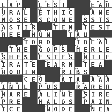 ACROSS 1. Pet locale 4. For fear that 8. Ewer handle 11. Mountain range 13. Moral principle 15. A saturated hydrocarbon 16. Characteristic smell of wine 17. Biscuitlike quick bread 18. Fast planes 19. Moving or stirring 21. Nine, plus one 22. Trial 23. To separate or throw off 24. Attila the _ 27. The 19th letter of the Greek alphabet 29. "Corrida" creature 30. Standard of perfection 34. Definite Article 36. Republicans 39. Haggard of country music 40. "______ My Girl" (Turtles hit) 41. _____ Park, CO 43. Mediterranean tributary 44. Feeling or showing extreme anger 46. Merit 47. Beverage made from leaves 48. "The Thinker" sculptor 49. Teases 51. Corporate head (abbr.) 53. _ moment's notice (2 wds.) 54. Auto club (abbr.) 57. International (abbr.) 60. Product of festering 63. More uncommon 65. Female horse 66. Place in a line 69. Beget 70. Before (prefix) 71. Auras 72. Ache 73. Frozen water 74. Connecting point 75. Teachers' org. DOWN 1. Type of eclipse 2. Came up 3. Thick mixture 4. French article 5. And so on (abbr.) 6. Guess 7. Prong on a fork 8. Relaxation 9. Pismires 10. Remainder 12. Flowery wreath 14. Penny 18. SAT takers 20. 17th letter of the Greek alphabet 25. Goad 26. Trap for birds or small mammals 28. Direct toward a target or goal 29. One of the two male reproductive glands 31. 4th largest of the Great Lakes 32. Silent film actress Nazimova 33. Area sheltered from the wind 34. Through, poetically 35. Froth on beer 37. Parent Teacher Association (abbr.) 38. Father Junipero _ 40. Title for a knight 42. In a ____ (agitated or irritated) 45. Compass dir. 50. Long, evenly shaped piece 52. Brightly colored fish 54. Believer in; advocate of (suffix) 55. Nest on high 56. Sports stadium 57. Body of Kaffir warriors 58. Drug cop 59. Family _ (genealogy) 61. Uhlan (variant) 62. Grain storage tower 64. Viper 67. Lower and raise head in agreement 68. Compass dir.