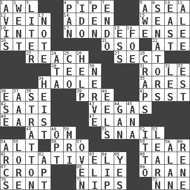 ACROSS 1. Leather borer 4. Corncob 8. At sea 12. Distinctive style or manner 14. Arabian gulf 15. Welt 16. To the inside or interior of 17. Unrelated to defense, as in spending 20. Proofreading order 21. Bear (Spanish) 22. Had dinner 23. Arrive at 27. Religious group 29. Adolescent 31. Hero or heavy, e.g. 34. White Person, in Hawaii 35. Ancient Greek god of war 36. Relaxation 39. Before (prefix) 41. Inconspicuous attention getter 42. Suttee (variant) 43. Viva Las _ 46. Hearing organs 47. Enthusiasm 48. Tiny particle 51. Slow-paced one 54. The first octave above the treble staff 56. Adept person 58. Separate forcefully 61. Happening in regular succession 66. Lie 67. Riding implement 68. Writer Wiesel 69. NW Algerian seaport 70. Transmitted 71. Pinches, bites 72. Compass dir. DOWN 1. Advice 2. Gone 3. 61 cubic inches 4. Baking dish 5. Wedding promise 6. Fenced enclosure 7. Inside; within (prefix) 8. Deep reverence 9. Legislators 10. Compass direction 11. Toward shelter 13. Brief written record 18. Double-curved letter 19. Enemy 24. _ moment's notice (2 wds.) 25. Corporate head (abbr.) 26. Aid 28. Dice game 30. Impudent aggressiveness 32. French article 33. Eastern Standard Time (abbr.) 34. Robbery 36. Compass dir. 37. American Automobile Association (abbr.) 38. Ski resort town in Vermont 40. Snakelike fish 44. Separate the seeds from cotton 45. Santa ___, CA 49. Elect 50. Medical imaging device (abbr.) 52. "Tell ____ the Marines!" 53. Acquire or gain knowledge or skills 54. Arches 55. Old wives' tales, e.g. 57. Baking chamber 59. Actor Alda or Thicke 60. French philosopher Descartes 62. Fitting 63. Biblical high priest 64. Mouth edge 65. It is so