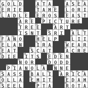 ACROSS 1. Gilded 5. "One Day ___ Time" 8. At sea 12. 4th largest of the Great Lakes 13. Docile 15. Australian parrot (variant) 16. Dipping utensil 18. Greek god of love 19. Compass direction 20. "We ___ not amused" (Victoria) 22. Photo 24. Woody plant 26. Nonscientific branch of learning 27. Is not 28. _ Lanka 29. The first octave above the treble staff 32. Papal veil 35. Aid 37. Cards in a Roman deck? 38. Liveliness 39. Retirement account (abbr.) 40. Erode 41. Consume 42. Leave at once 43. 43,560 square feet 44. Pass on 45. It is 46. Locale of original sin 49. And not 50. Texas town _ City 51. Player piano 55. Compass dir. 56. Backtalk 57. Indonesian resort city 59. N. Chile seaport 63. Water jar 64. Give off 65. Dutch treat 66. Stitch closed the eyes of (a falcon) 67. Parent Teacher Association (abbr.) 68. Round or rotation of duties DOWN 1. Set 2. Mouth or opening 3. Flaplike covering 4. Accusation by an informer 5. Had dinner 6. Canvas cover 7. Mine, in Marseilles 8. Native American of Southwest Alaska 9. Fly high 10. Celtic language 11. Small island 14. Fortification 17. Blunders 21. Car or cant ending 23. Three (prefix) 25. Value system 28. Scheduled 29. Actor Baldwin 30. One who doesn't tell the truth 31. Hoop that covers a wheel 32. Nourish 33. Mountain range southwest of Kyrgyzstan 34. Nathan's nickname 36. Period 40. Roamer 42. Disco prop 45. Electrically charged atom 47. Spanish title 48. Pulitzer Prize-winning author Ferber 49. Rhinal 51. Diluted with white 52. Capri or Wight 53. Desk light 54. Set down 56. Distress signal 58. Call ___ day 60. Wedding promise 61. Domesticated feline 62. Housemaid (var.)
