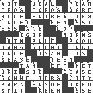 ACROSS 1. Small island 4. Freehold land 8. Lightbulb-shaped fruit 12. Greek god of love 14. Traditional theme or motif 16. Legendary monster 17. Hero or heavy, e.g. 18. Pleas 20. An arm off of a larger body of water 22. Car or cant ending 23. Fast jet (abbr.) 24. Curvy letter 25. Adept person 28. Trim (branches) 30. Russian composer Stravinsky 31. Typical models 35. Storage container 37. Whimper 40. "Silly old bear" 41. Mild oath, euphamism for damn 42. Odor 44. Ear part 45. At one time in the past 46. Russian ruler of old 47. ___ a Wonderful Life 48. Gospel singer Marvin 50. Adolescent 52. Scottish cap 54. Bank Draft (abbr.) 55. Was introduced to 58. RI univ. 61. "Barney Miller" actor Jack 63. Desist 65. Wine waiters 70. Municipality 71. Dad 72. Follow as a consequence or result 73. Wrote a lyric poem 74. Stricken, poetically 75. Peachy ____! 76. Compass dir. DOWN 1. Nest on high 2. Metal shackles 3. For Whom the Bell _____ 4. Shoshoni 5. Spanish title 6. Fitting 7. Old wives' tales, e.g. 8. Cooking vessel 9. The front part of a cuirass 10. Ancient Greek god of war 11. Remainder 13. Observe 15. Sew up the eyelids of hawks and falcons 19. Soon (poet.) 21. Label 26. 911 reaches them 27. Spew [out] 29. Cotton for raincoats, e.g. 30. Swallow 32. Carrot, for example 33. Disorderly crowds 34. A female animal or person 35. Object of repulsion 36. South American Indian 38. French article 39. Maternal 41. Two (Sp.) 43. Not kosher 49. Comfort 51. And so on (abbr.) 53. Undercover agent 55. Women servants 56. _____ Park, CO 57. Miss Universe 1986, Barbara Palacios _ 58. United States Postal Service (abbr.) 59. Wander 60. Body of Kaffir warriors 62. Pig sound 64. Environmental prefix 66. Floor protector 67. Compass dir. 68. Regret 69. Elected rep.