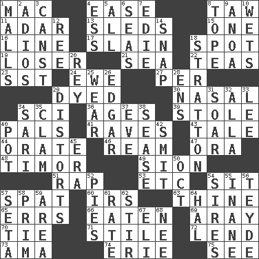 ACROSS 1. Apple computer (short form) 4. Relaxation 8. The 23rd letter of the Hebrew alphabet 11. The sixth month of the Jewish calendar 13. Bobsleighs 15. Single 16. Actor's bit 17. Killed 18. Blemish 19. Failure 21. Ocean 22. Afternoon social gatherings 23. Fast jet (abbr.) 24. She-sheep 27. For each 29. Colored 30. Relating to the nose 34. _-fi 36. Eras 39. Fur scarf 40. Friends 41. All-night dance parties 43. Falsehood 44. Declaim 46. 480, 500 or 516 sheets of paper 47. Mouth or opening 48. The easternmost of the Lesser Sundas 49. The Jewish people; Israel 51. Reproach for some lapse or misdeed 53. And so on (abbr.) 54. Be seated 57. Argument over a trivial matter 60. Big collection agency 63. One or ones belonging to thee 65. Blunders 66. Ingested 69. Like ___ of sunshine 70. Standoff 71. Vertical member of a panel or frame 72. Grant temporary use of 73. Housemaid (var.) 74. One of the Great Lakes 75. Perceive with the eye DOWN 1. Promenades 2. Goodbye (Sp.) 3. 2nd pers. sing. pres. of can (arch.) 4. Curvy letter 5. Everything 6. Oceans 7. Singer Brickell 8. Drink excessively 9. Small Philippine buffalo 10. Moistens 12. Portuguese money of account (variant) 14. Fastener 18. Ski resort town in Vermont 20. Marina Del _, California 25. Put on (as clothing) 26. _ Allan Poe 28. Followers of ems 29. What propaganda does 31. Fly high 32. Silent film actress Nazimova 33. Area sheltered from the wind 34. Indian skirt 35. Burrowing marine mollusk 37. Night before a holiday 38. Gospel singer Marvin 40. Plant holder 42. Stricken, poetically 45. Period 50. Sep. follower 52. Sliced desserts 54. Titles for men of rank and authority 55. Silly 56. Miss Universe 1986, Barbara Palacios _ 57. Bristle 58. Demure 59. Type of rug 61. Assign a rank or rating to 62. Move through with a circular motion 64. Actor Linden 67. Connecticut Ivy Leaguer 68. Born