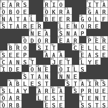 ACROSS 1. Hearing organs 5. _ de Janeiro 8. Call ___ day 11. Mitch Miller's instrument 12. Gumbo ingredient 14. Slender fish 15. Relating to or accompanying birth 17. Fermented drink made from hops 18. Eighteen holes 19. A viewer who gazes fixedly 21. Poe poem 23. Teachers' org. 25. Fastener 26. Aroma 27. Ewer handle 28. For each 31. Sis' sibling 33. Be seated 35. Cell (Danish) 37. Ooze 38. American Automobile Association (abbr.) 40. Relaxation 41. 2nd pers. sing. pres. of can (arch.) 43. Passenger plane 45. Sodium hydroxide 46. Binary compound 47. Single 50. Lubricates 52. Comedian Laurel of Laurel & Hardy 53. Compass dir. 54. Most capable 56. Flight of steps 61. Kill 62. Length times width 65. Disorder 66. Rowing implement 67. For fear that 68. Portable shelter 69. Globe 70. Compass dir. 71. Fast planes DOWN 1. Immeasurably long periods of time 2. Blind as ____ 3. Roll call or roster of names 4. Wither 5. Director Reiner 6. Mamie's husband 7. Threatening words 8. Composer Stravinsky 9. Story 10. Sandy's bark 13. Sports stadium 16. Grant temporary use of 18. Grand Old Party 20. Vintage cars 22. Drug cop 24. Operatic vocal solo 26. I made a mistake 28. Romp 29. Otherwise 30. To riddle 31. Necklace unit 32. French philosopher Descartes 34. _ Mahal 36. Snakelike fish 37. _-fi 39. A really long time 42. Lug 44. Metal containers 48. Relating to the nose 49. Main course 51. Allows 52. Secret 54. Having or resembling wings 55. Sharp remark 57. Flats, for short 58. Angers 59. The smallest animal of a litter 60. Arranges properly for use 61. "Barney Miller" actor Jack 63. Double-curved letter 64. Had dinner