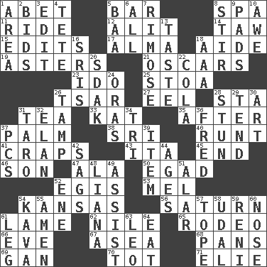 ACROSS 1. Collude with 5. Oblong piece of solid material 8. Health resort 11. Travel on or in a vehicle 12. Came down and settled, as after flight 14. The 23rd letter of the Hebrew alphabet 15. Proofreads 17. _ mater 18. Assistant 19. Michaelmas daisies 21. Motion picture awards 23. Wedding promise 25. Portico 26. Russian ruler of old 27. Snakelike fish 28. R.R. building 31. Beverage made from leaves 33. Krazy ___ of comics 35. Following 37. Inside of hand 38. Indian title of respect (Mr.) 40. Undersized animal 41. Dice game 43. Call ___ day 45. Conclude 46. Male child 47. Chicken ___ king 50. Mild oath 52. The front part of a cuirass 53. Cartoonist voice _ Blanc 54. Sunflower state 56. Titan orbits this 61. Unable to walk 62. Mediterranean tributary 65. Cowboy competition 66. Night before a holiday 67. At sea 68. Zero-star reviews 69. Separate the seeds from cotton 70. Small child 71. Writer Wiesel DOWN 1. Type of rug 2. Auction offers 3. Prepare for publication 4. Wig 5. Sound made by sheep 6. 100% 7. Full of chinks, cracks, or crevices 8. Use a spoon 9. Writing tablets 10. Deep reverence 13. Clothes sense 16. Indian titles of respect 18. American Automobile Association (abbr.) 20. Neighbor of Neb. 22. Root beer relative 24. Mouths or openings 26. Pack (down) 28. Make senseless or dizzy 29. Watch over 30. Nonscientific branch of learning 31. Pacific island yam 32. Liveliness 34. Three (prefix) 36. Flintstone 37. Personal Computers (abbr.) 39. A whole individual unit 42. Sinks 44. Grows older 48. Woody, climbing, usually tropical plant 49. Help 51. Having or resembling wings 52. Compass dir. 54. Polynesian shrub of the pepper family 55. So be it 57. Drink excessively 58. Freehold land 59. Painter Guido (1575-1642) 60. Characteristic smell of wine 61. Part of a journey 63. Lion 64. Erode
