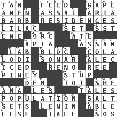 ACROSS 1. Scottish cap 4. Nourish 8. Stare wonderingly 12. So be it 14. Slender Brazilian palm 16. Operatic vocal solo 17. Sharp remark 18. Homes 20. Pale purple color 22. Put into a specified state 23. Fast jet (abbr.) 24. Compass dir. 25. The grampus (Milton) 28. Had dinner 30. Capital of Western Samoa 31. Indian state 35. Experiment locale 37. Alliance 40. Root beer relative 41. Farming town in central California 42. Echolocation 44. Actor Baldwin 45. On the rocks 46. Western Nevada city 47. To separate or throw off 48. Abounding in pines 50. Obstruct or block passage 52. Lair 54. Small child 55. A female animal or person 58. Santa ___, CA 61. French article 63. Lies 65. Census information 70. Table seasoning 71. Puts into a specified state 72. Soviet premier 1918-24 73. Competent 74. Otherwise 75. Lie 76. Distress signal DOWN 1. Eating place 2. With great haste 3. Haggard of country music 4. Distant 5. Compass dir. 6. Double-curved letter 7. Raised platform 8. Separate the seeds from cotton 9. Curves 10. Sliced desserts 11. Compass direction 13. Basketball assoc. 15. It may be bright or harebrained 19. Singer James 21. Police officer (slang) 26. Teases 27. Bodily heat indicating an inflammation 29. Fortification 30. Remained 32. Flatfish 33. Toward shelter 34. Big _ 35. Locales 36. An important port of Yemen 38. Single 39. 2nd pers. sing. pres. of can (arch.) 41. Mouth edge 43. Printing process, for short 49. Shout 51. Baseball player Mel 53. Be tempered by heat 55. Thick slices 56. Phone greeting 57. _____ Park, CO 58. Domed church section 59. Christmas carol 60. Flats, for short 62. Proofreading order 64. White ___ sheet 66. Purpose 67. _ tizzy (2 wds.) 68. Petroleum 69. Compass dir.