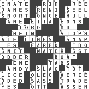 ACROSS 1. Maternal 6. To free from 9. To sift 12. Natives or inhabitants of Denmark 13. Painter Guido (1575-1642) 14. Sew up the eyelids of hawks and falcons 15. Derisive sound 16. Single time 17. Frame or body of a ship 18. One (Scot) 19. Singer James 20. Immeasurably long periods of time 21. "Corrida" creature 23. Fr. "Yes" 24. It's straight from the horse's mouth 25. Discontinues 28. Had dinner 30. Citrus fruits 34. Fastener 35. French article 36. Having ears or earlike features 38. Wedding promise 39. In a ____ (agitated or irritated) 41. Wetness 43. Fast jet (abbr.) 44. More peculiar 46. Water vessel 48. Compass dir. 49. Bar bills 50. "60 Minutes" Commentator Rooney 51. Volcanic refuse 53. Small child 56. Louse (plural) 57. Cassini of fashion 58. Nest on high 60. Wrote a lyric poem 61. Backtalk 62. Buy and sell 63. Affirmative reply 64. Baseball player Mel 65. NE Netherlands city DOWN 1. Begley and Asner 2. Nanny 3. Soon (poet.) 4. Cigar-shaped 5. Eastern Standard Time (abbr.) 6. Monthly bill 7. South American Indian 8. Expire 9. One who advocates reunion 10. Snakelike fish 11. Pipe bend 13. Printing process, for short 14. Yells 19. Bert's buddy 20. Greek goddess of the dawn 22. Petroleum 24. Dwellings 26. Writing tablets 27. Specific locale 28. In addition 29. Watch over 31. Informal term for the mouth 32. Epoch 33. Put into a specified state 37. Debunk (Brit. slang) 40. Looked after 42. Director Reiner 45. Marina Del _, California 47. Michaelmas daisies 49. Labels 50. Assistant 51. Narrow board 52. For fear that 54. Mouths or openings 55. Periodic rise and fall of the sea level 56. Myrna of the movies 57. Bear (Spanish) 58. "One Day ___ Time" 59. Car or cant ending