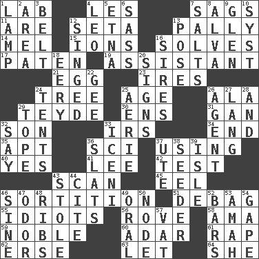 ACROSS 1. Experiment locale 4. French article 7. Settles 11. "We ___ not amused" (Victoria) 12. Bristle 13. Friendly 14. Cartoonist voice _ Blanc 15. Charged atoms 16. Finds the solution 17. Eucharist need 19. Aide 21. Oval reproductive body of a fowl 23. Angers 24. Family _ (genealogy) 25. Personal question 26. In the manner of 29. Miss Universe 1986, Barbara Palacios _ 30. Followers of ems 31. Separate the seeds from cotton 32. Manchild 33. Big collection agency 34. Conclusion 35. Fitting 36. _-fi 37. Putting into practice 40. It is so 41. Area sheltered from the wind 42. Trial 43. Glance over 45. Snakelike fish 46. Making a chance decision by using lots 51. Debunk (Brit. slang) 55. Foolish or stupid persons 56. Be footloose 58. Housemaid (var.) 59. Having high moral qualities 60. The sixth month of the Jewish calendar 61. Strike 62. Celtic language 63. Allow 64. A female animal or person DOWN 1. Desk light 2. Type of rug 3. Waist strap 4. Lion 5. Inactive volcano in Sicily 6. Backtalk 7. Table seasonings 8. Inventor's middle name 9. Small, secluded valley 10. System (abbr.) 12. Scorched 13. Airs 16. Titles for men of rank and authority 18. Suggestive of the supernatural 20. Signals 22. Turn to the right 24. Portable shelters 25. Nest on high 26. Rep 27. Austrian-born American filmmaker Fritz 28. Also 29. Drink excessively 32. Declare 33. Ancient Celtic tribe of eastern Britain 36. Narrow boards 37. Shoshoni 38. Sowing specialist 39. Small island 43. Took without asking 44. Quote 46. Trig term 47. Aroma 48. Chest bones 49. Relating to the mouth 50. Connecting point 52. Drinking establishments 53. Wet nurse 54. Open wide 57. Large container