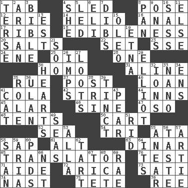 ACROSS 1. Keyboard key 4. Downhill vehicle 8. Airs 12. One of the Great Lakes 14. Sun: prefix 16. Of or related to the anus 17. Chest bones 18. The property of being fit to eat 20. Table seasonings 22. Arrange properly for use 23. Compass dir. 24. Compass dir. 25. Lubricate 28. Single 30. Like (prefix) 31. Place in a line 35. Sorrow 37. Mail 40. Grant temporary use of 41. Root beer relative 42. Empty completely 44. Taverns 45. Having or resembling wings 46. Trig term 47. Bear (Spanish) 48. Portable shelters 50. Draw slowly or heavily 52. Ocean 54. Three (prefix) 55. "One Day ___ Time" 58. Plant excrement 61. Keyboard modifier key 63. Middle Eastern gold or silver currency 65. Interpreter 70. Trial 71. Helper 72. N. Chile seaport 73. Suttee (variant) 74. Political cartoonist Thomas 75. False hair 76. Portuguese money of account (variant) DOWN 1. Laconic 2. Believer in; advocate of (suffix) 3. Instruction Manual for Humans 4. A female animal or person 5. Directed 6. Biblical high priest 7. Claim 8. Baking dish 9. Washington bills 10. Backtalk 11. Otherwise 13. Eastern Standard Time (abbr.) 15. Butter sub 19. Inactive volcano in Sicily 21. "Barney Miller" actor Jack 26. Naughty children 27. Plunders 29. American author Paul (1891-1958) 30. Centers 32. Charged particles 33. Billionth: prefix 34. Followers of ems 35. Hero or heavy, e.g. 36. ____ Bator 38. _ Lanka 39. Tinged 41. Domesticated feline 43. Lightbulb-shaped fruit 49. Oceans 51. To free from 53. Silent film actress Nazimova 55. Approach 56. Clothes sense 57. Nick name for Arthur 58. Comedian Laurel of Laurel & Hardy 59. Operatic vocal solo 60. Groovy apts. 62. Small pie 64. ___ a Wonderful Life 66. Fish or hair follower 67. Neckwear 68. Sep. follower 69. Actress Charlotte