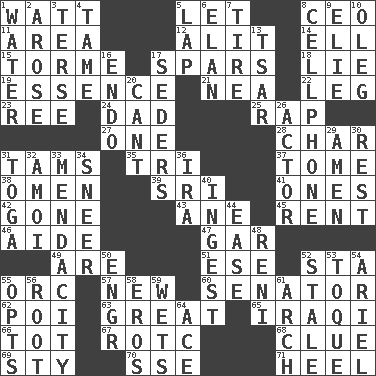 ACROSS 1. Electrical Unit 5. Allow 8. Corporate head (abbr.) 11. Type of rug 12. Set down 14. Pipe bend 15. Singer Mel 17. Practice fights 18. Falsehood 19. Core 21. Teachers' org. 22. Part of a journey 23. To riddle 24. June honoree 25. Strike 27. Single 28. Burn to charcoal 31. Scottish caps 35. Three (prefix) 37. Heavy book 38. Sign of things to come 39. Indian title of respect (Mr.) 41. Washington bills 42. Went 43. A saturated hydrocarbon 45. Monthly bill 46. Helper 47. Slender fish 49. "We ___ not amused" (Victoria) 51. Compass dir. 52. R.R. building 55. The grampus (Milton) 57. ___ Haven, CT 60. Legislator 62. Luau course 63. Relatively large 65. Resident of Iraq 66. Small child 67. College mil. group 68. A slight indication 69. Filthy place 70. Compass dir. 71. The bottom of a shoe or boot DOWN 1. Wetness 2. Came up 3. Laconic 4. Not wild 5. Infant locale 6. Enthusiasm 7. Become fatigued 8. Portable communications device 9. Writer Wiesel 10. Cassini of fashion 13. Russian ruler of old 16. Inside; within (prefix) 17. Spring feasts 20. Patter 26. Thespian 29. So be it 30. Repose 31. Ancient Roman robe 32. Mine, in Marseilles 33. Ananias' fault 34. Contemptuous expression 36. Retirement account (abbr.) 40. Consume 44. Comfort 48. Painter Guido (1575-1642) 50. Engineer (abbr.) 52. Showing deterioration from age 53. Woman's close-fitting hat 54. Satellite of Uranus 55. Elects 56. Carrot, for example 58. Greek god of love 59. Moistens 61. Bowlike part 64. Adept person