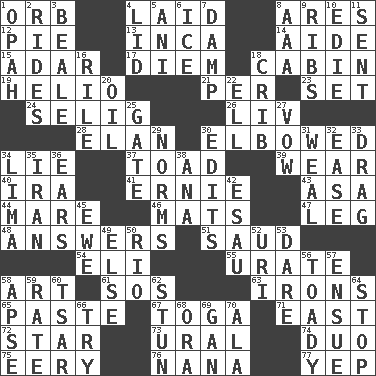 ACROSS 1. Globe 4. Put down 8. Ancient Greek god of war 12. Sliced dessert 13. South American Indian 14. Assistant 15. The sixth month of the Jewish calendar 17. South Vietnam president (1954) 18. Apartment or room in a ship 19. Sun: prefix 21. For each 23. Arrange properly for use 24. Major League Baseball Commissioner Bud 26. 54 in ancient Rome 28. Liveliness 30. Shoved, as through a crowd 34. Falsehood 37. Frog relative 39. Put on (as clothing) 40. Lyricist Gershwin 41. Bert's buddy 43. White ___ sheet 44. Female horse 46. Floor coverings 47. Part of a journey 48. Responses 51. Saudi Arabian king (1953-1964) 54. Biblical high priest 55. A salt of uric acid 58. Tate display 61. Mayday 63. Metal shackles 65. Thick mixture 67. Ancient Roman robe 71. Compass direction 72. Play the lead 73. Mountain range 74. Superhero pair 75. Suggestive of the supernatural 76. Grandmother 77. Slangy assent DOWN 1. Brightly colored fish 2. Amusement-park features 3. Memphis, Tenn. Street 4. Hat (slang) 5. Black tropical American cuckoo 6. Frozen water 7. Moist 8. Auto club (abbr.) 9. Chest bones 10. Singer Brickell 11. Posted 16. Cause heat under the collar 18. Baby bed with high sides 20. Lubricate 22. Pipe bend 25. Yard entry 27. Solemn pledge 29. Typical models 30. Proofreads 31. Welt 32. Relaxation 33. To draw with force 34. Pale green bean 35. SW Asia republic 36. Hearing organs 38. Santa ___, CA 42. He sold his birthright 45. She-sheep 49. Otherwise 50. River (Sp.) 52. RI univ. 53. Have the gumption 56. Sycophant 57. Follow as a consequence or result 58. Domed church section 59. Assign a rank or rating to 60. Russian ruler of old 62. Make senseless or dizzy 64. Obstruct or block passage 66. Attempt 68. Mouth or opening 69. Separate the seeds from cotton 70. In the manner of