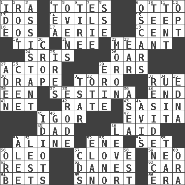 ACROSS 1. Lyricist Gershwin 4. Lugs 9. "Beetle Bailey" pooch 13. Two (Sp.) 14. Vices 15. Ooze 16. Greek goddess of the dawn 17. Nest on high 18. Penny 19. Nervous spasm 21. Born 22. Intended 24. Indian titles of respect 26. Boat paddle 27. Thespian 29. Blunders 30. Window treatment 31. "Corrida" creature 33. Sorrow 36. Car or cant ending 37. French poetic form 40. Conclusion 41. Fish or hair follower 42. Pace 43. Indian antelope 45. Composer Stravinsky 47. Webber/Rice musical 48. June honoree 49. Put down 50. Place in a line 52. Compass dir. 54. Put into a specified state 56. Butter sub 57. Garlic unit 59. Modern: prefix 61. Relief 62. Natives or inhabitants of Denmark 63. Automobile 64. Antes 65. Derisive sound 66. Period DOWN 1. Binary compound 2. Carrot, for example 3. Helper 4. Afternoon social gathering 5. Baking chambers 6. Become fatigued 7. Writer Wiesel 8. Compass dir. 9. Motion picture awards 10. Adolescent 11. Portable shelter 12. Elect 20. Riding implement 22. Person of subnormal intelligence 23. Hearing organ 25. Angers 27. Arabian gulf 28. Algonquian 29. One of the Great Lakes 31. Russian ruler of old 32. Baseball player Mel 33. Home 34. A single undivided whole 35. Pulitzer Prize-winning author Ferber 38. Wear away 39. At sea 44. Opinion 45. Foolish or stupid persons 46. Separate the seeds from cotton 49. Crowbar 50. Toward shelter 51. For fear that 52. Liveliness 53. Words to Nanette 55. Rend 56. Globe 57. Music discs 58. Eastern Standard Time (abbr.) 60. Mouth or opening