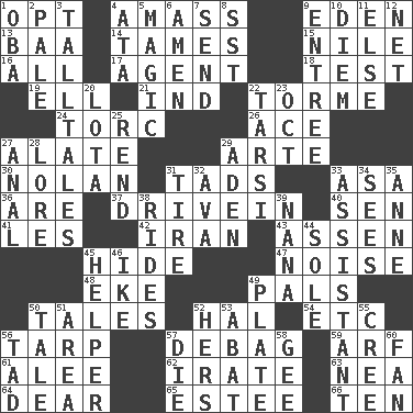ACROSS 1. Choose 4. Collect or gather 9. Locale of original sin 13. Sound made by sheep 14. Softens 15. The longest river in the world 16. 100% 17. Representative 18. Trial 19. Pipe bend 21. Working for oneself (abbr.) 22. Singer Mel 24. Torque (variant) 26. Adept person 27. Having winglike extensions 29. Johnson of "Laugh-In" 30. Pitcher Ryan 31. Bits 33. White ___ sheet 36. "We ___ not amused" (Victoria) 37. Popular '50s hangout 40. Elected rep. 41. French article 42. SW Asia republic 43. NE Netherlands city 45. Flintstone garb 47. Annoying sound 48. Supplement with great effort 49. Friends 50. Lies 52. Actor Linden 54. And so on (abbr.) 56. Canvas cover 57. Debunk (Brit. slang) 59. Sandy's bark 61. Toward shelter 62. Feeling or showing extreme anger 63. Teachers' org. 64. Letter starter 65. First name in cosmetics 66. "___ Little Indians" DOWN 1. Chief or king in Benin or Nigeria 2. Diluted with white 3. Baron Munchausen's specialties 4. "One Day ___ Time" 5. Mysterious quality of enchantment 6. So be it 7. Transmit 8. Fast jet (abbr.) 9. Main course 10. South Vietnam president (1954) 11. Otherwise 12. Remaining after all deductions 20. Globular water bottle used in Asia 22. Tarsus (plural) 23. Sep. follower 25. Tear apart 27. Of or related to the anus 28. Old wives' tales, e.g. 29. An important port of Yemen 31. Hoop that covers a wheel 32. Actress Gardner 33. Helper 34. Observes 35. Queen of England 1702-14 38. Amusement-park features 39. Nanny 44. Not divided or shared with others 45. Assistant 46. Mamie's mate 49. Food holder 50. Lie 51. Length times width 52. Possessive pronoun 53. Blind as ____ 55. Algonquian 56. Bit 57. Expire 58. Turn to the right 60. Air blower