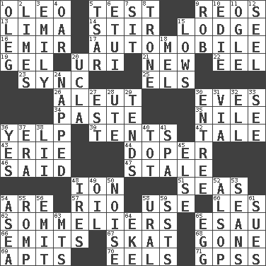 ACROSS 1. Butter sub 5. Trial 9. Vintage cars 13. Pale green bean 14. Use a spoon 15. Inn 16. Arab leader 17. Car 19. Set 20. RI univ. 21. ___ Haven, CT 22. Snakelike fish 23. Synchronize (abbr.) 25. Raised railways 26. Native American of Southwest Alaska 30. Nights before holidays 34. Thick mixture 35. The longest river in the world 36. Sharp bark 39. Portable shelters 42. Story 43. 4th largest of the Great Lakes 44. Drug addict 46. Stated 47. Lacking originality or spontaneity 48. Electrically charged atom 51. Oceans 54. "We ___ not amused" (Victoria) 57. River (Sp.) 58. Purpose 60. French article 62. Wine waiters 65. He sold his birthright 66. Sends forth 67. Three-handed card game 68. Went 69. Flats, for short 70. Snakelike fish 71. Global Positioning Systems (abbr.) DOWN 1. Cassini of fashion 2. Citrus fruits 3. Poet Dickinson 4. Boat paddle 5. Russian ruler of old 6. Needle case 7. Be seated 8. Heavy duty weighing machine 9. Director Reiner 10. Singer Brickell 11. Stare at amorously 12. Stitch closed the eyes of (a falcon) 15. Coldest temperatures 18. Cartoonist voice _ Blanc 20. Southern CA. univ. 24. Slept 27. Eastern Standard Time (abbr.) 28. Shoshoni 29. Watches over 30. Main course 31. By way of 32. Pipe bend 33. Observe 36. It is so 37. Epoch 38. Cards in a Roman deck? 40. Small child 41. Health resort 45. Otherwise 48. Angers 49. Petroleum 50. Annoying sound 52. Columnist Joseph or Stewart 53. Actors Connery and Penn 54. Toward the sea 55. Play 56. Send forth 58. Mountain range 59. Fast planes 61. Institutes legal proceedings 63. Mountains (abbr.) 64. Supplement with great effort 65. Ovum